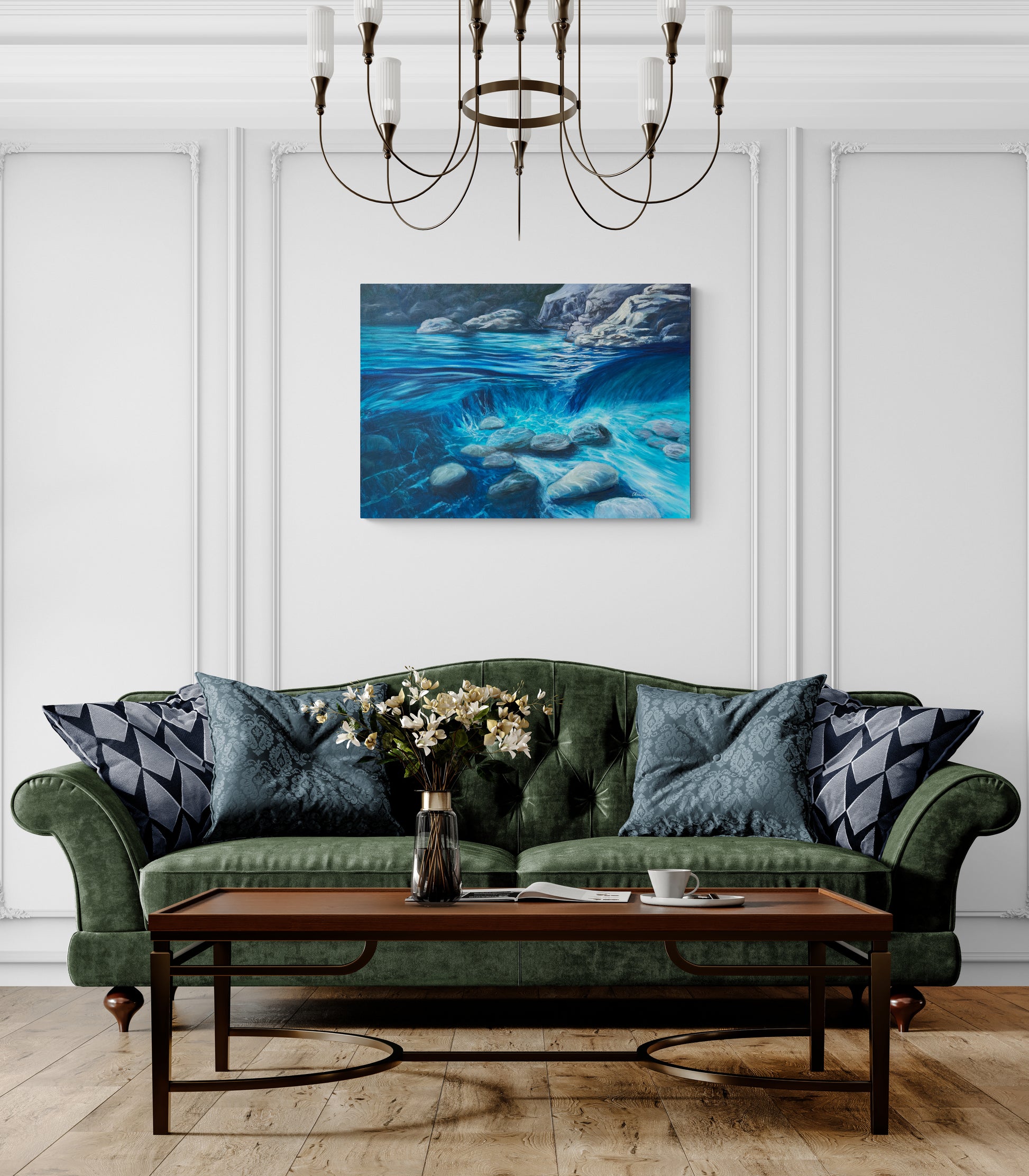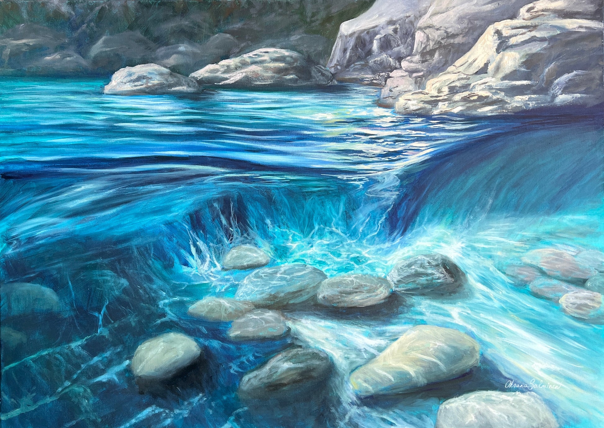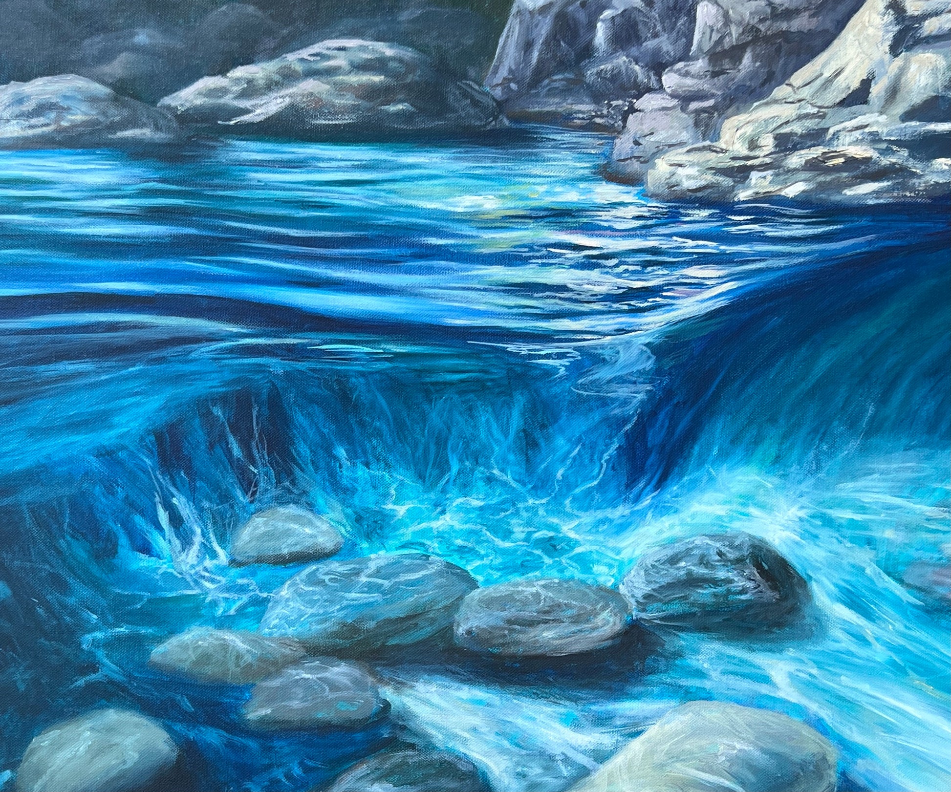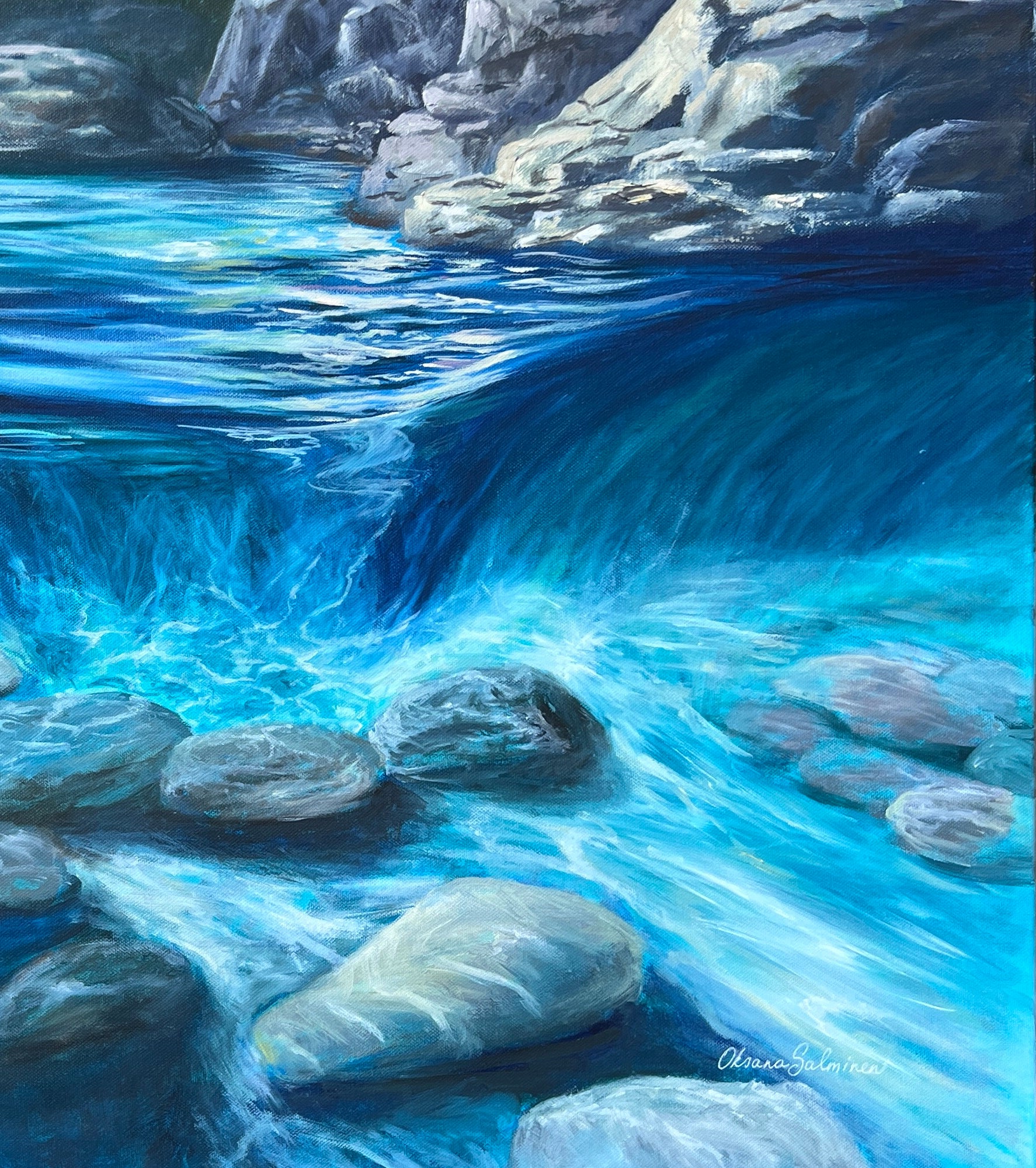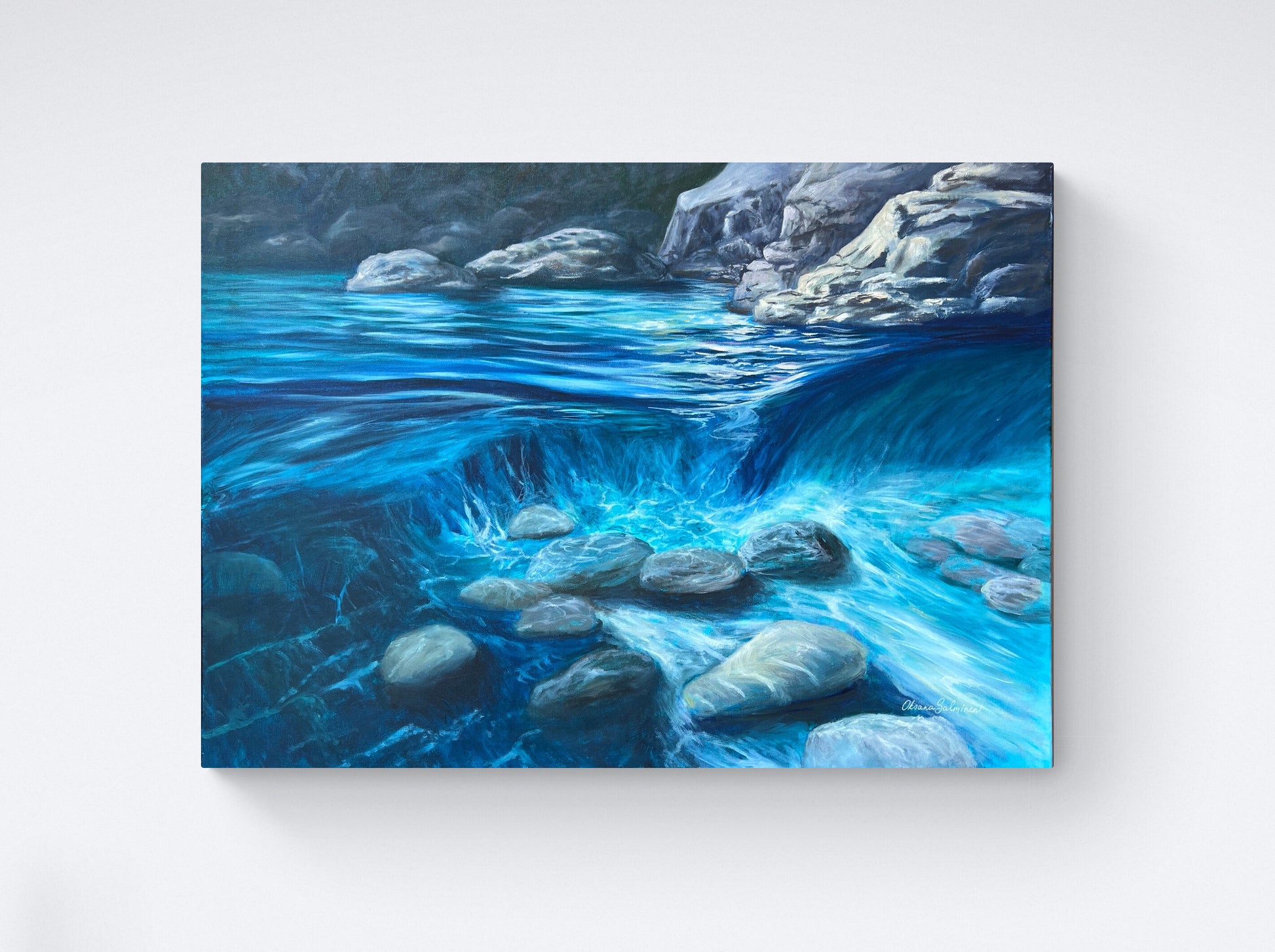 In this painting, I explored the juxtaposition of calm and tumult within natural landscapes. The tranquil blues and soft whites capture moments of serenity, while the dynamic waves express nature's unbridled energy. This piece mediates the balance of gentleness and power in life, aiming to bring peace and invigoration into any space it occupies.