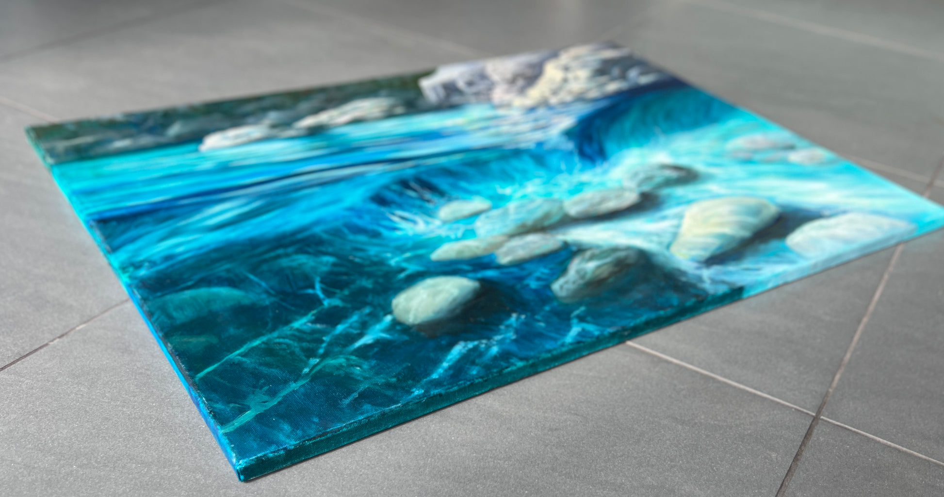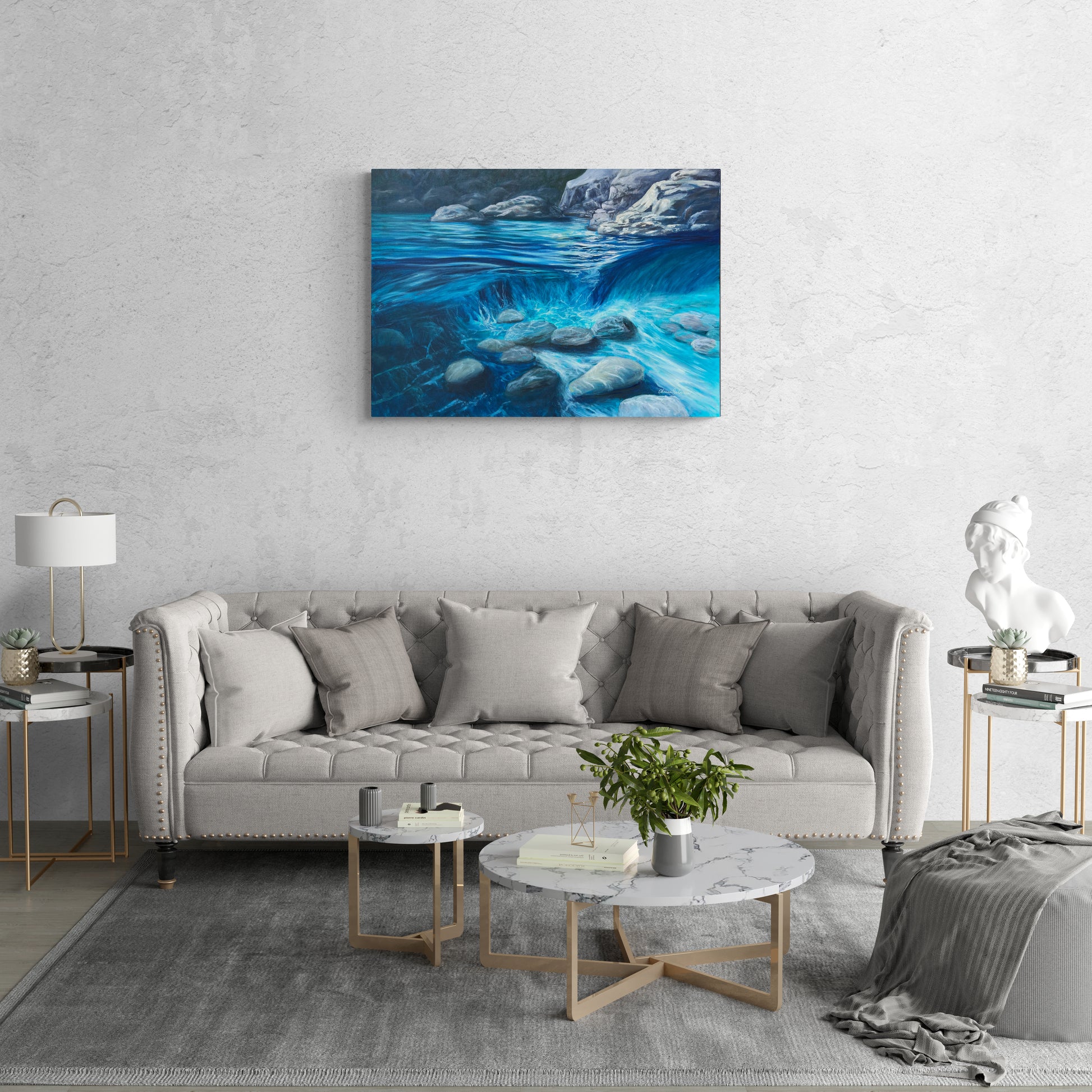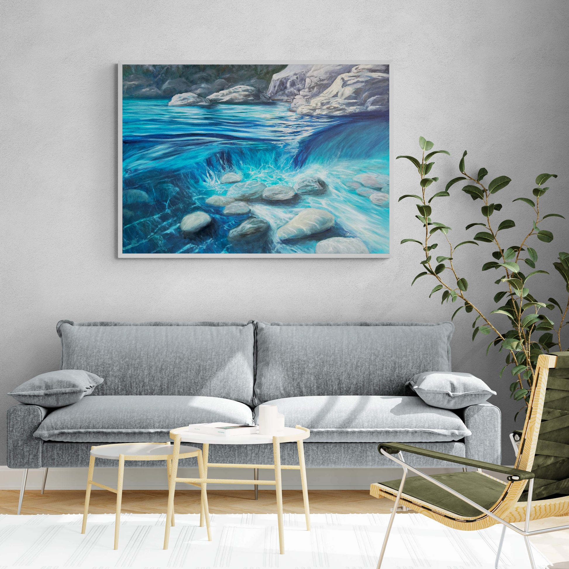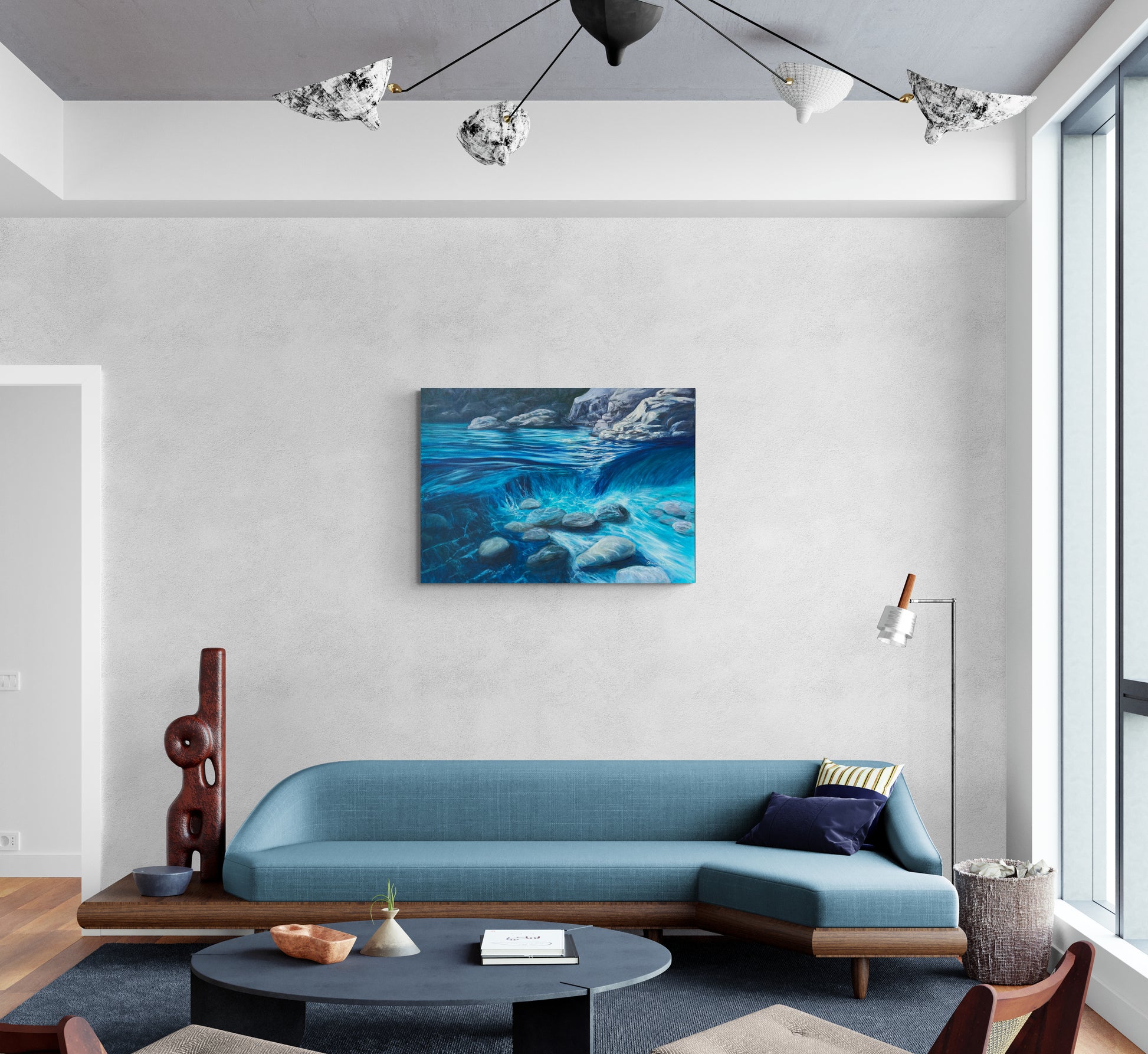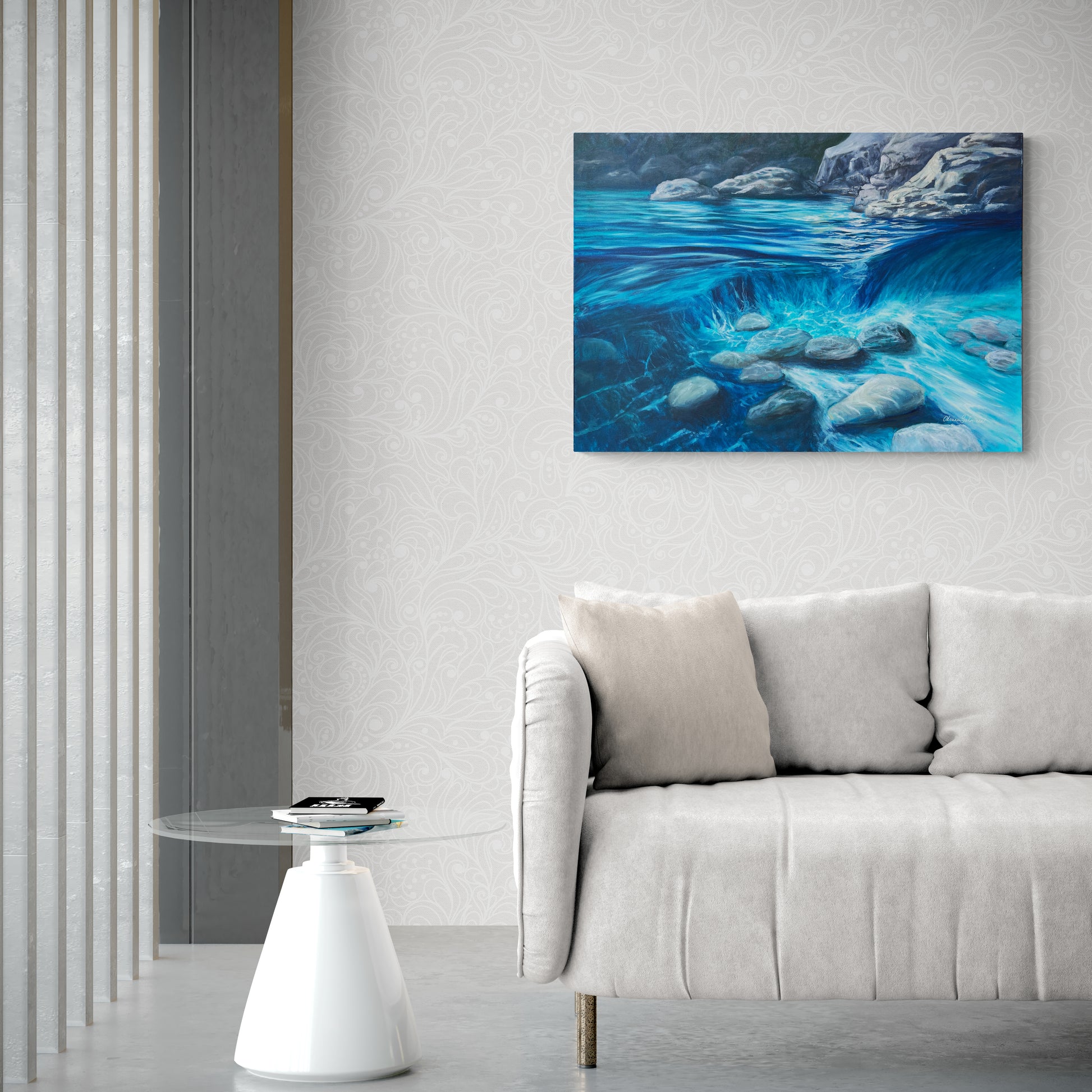 In this painting, I explored the juxtaposition of calm and tumult within natural landscapes. The tranquil blues and soft whites capture moments of serenity, while the dynamic waves express nature's unbridled energy. This piece mediates the balance of gentleness and power in life, aiming to bring peace and invigoration into any space it occupies.