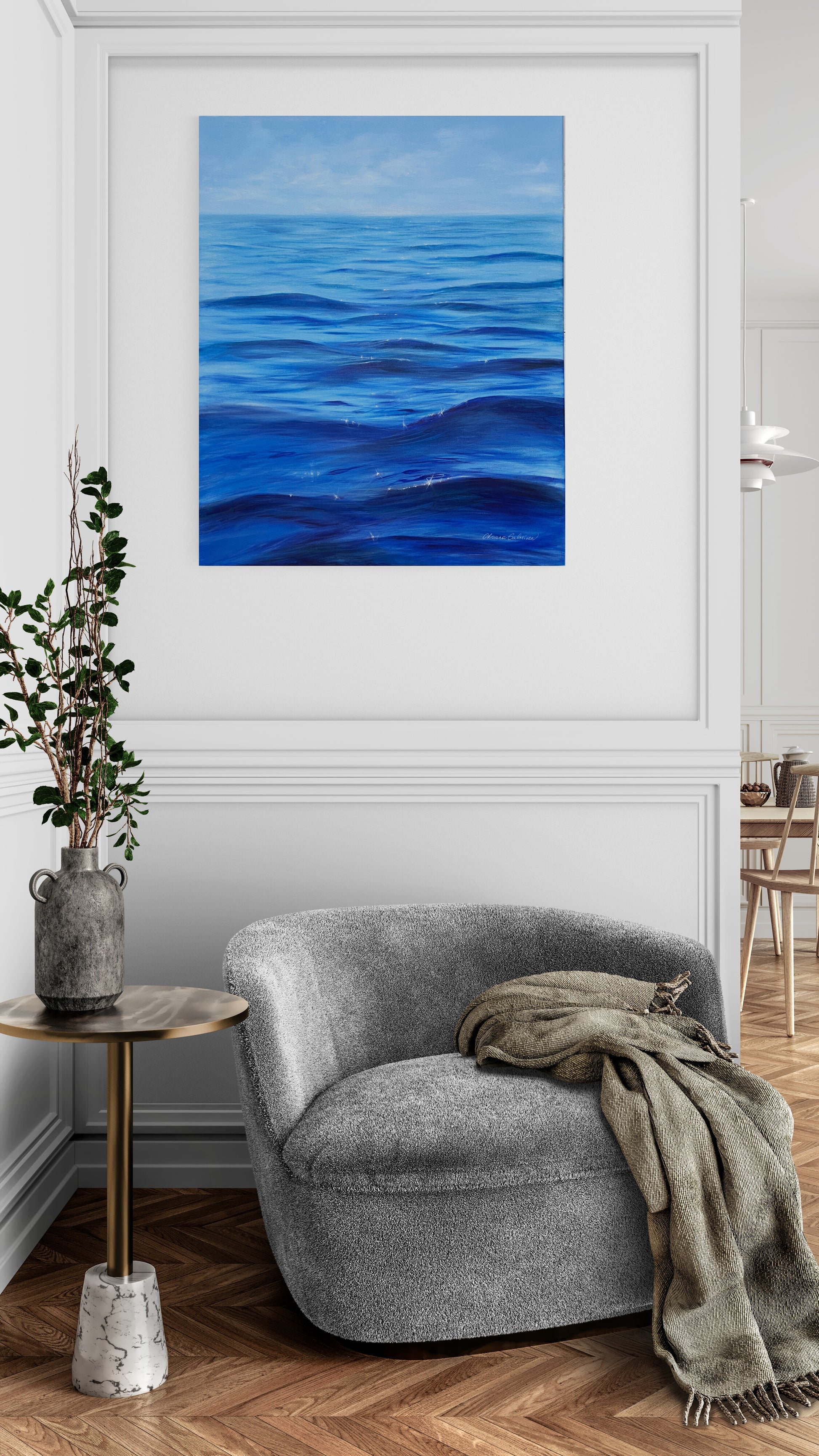 In this painting, I used oil paints to show the calming yet lively nature of water. I combined impressionism and realism to reflect the gentle waves and deep parts of water. The different shades of blue create a feeling of calm and a strong connection with nature, bringing a soothing and positive vibe into any home.