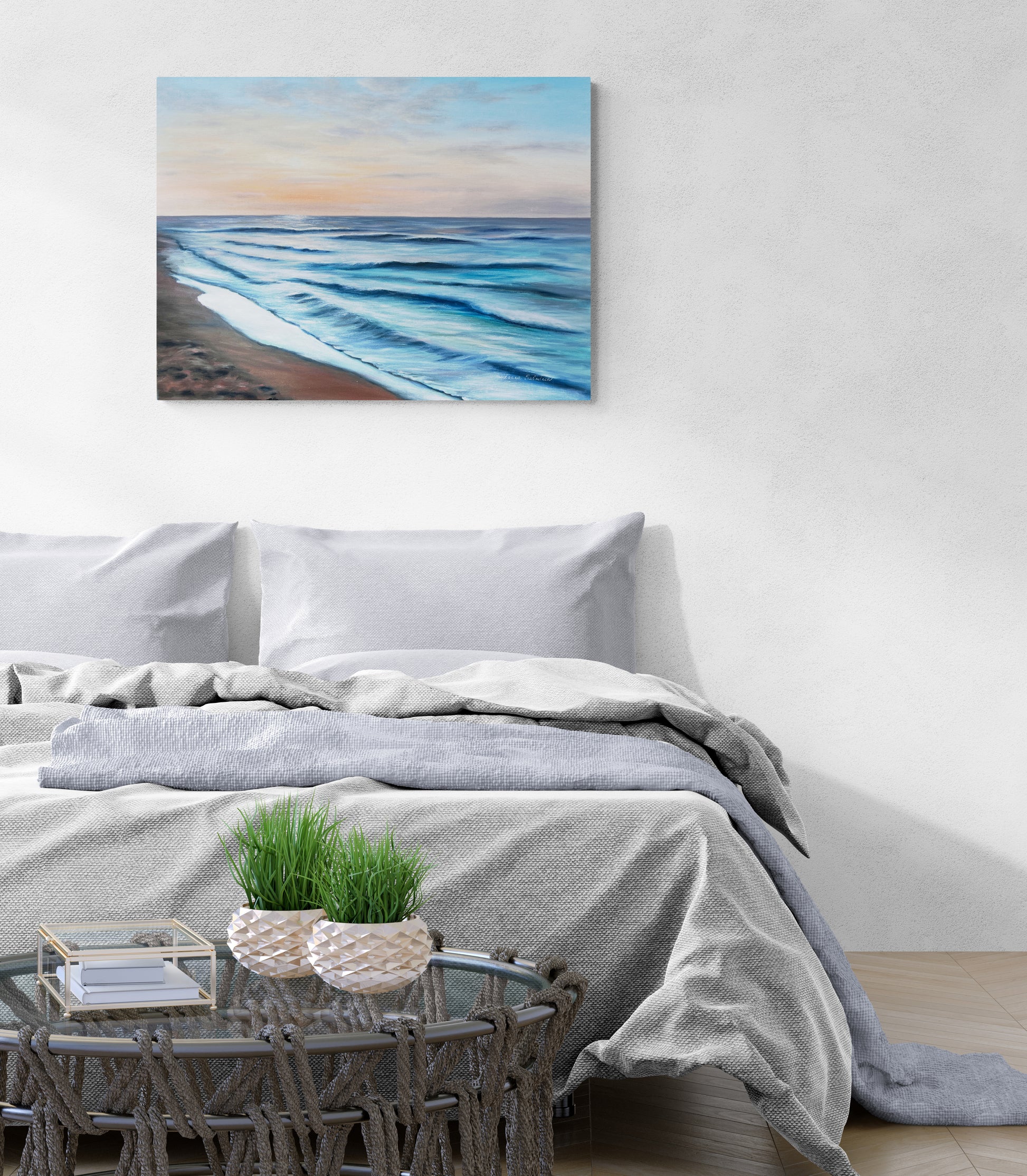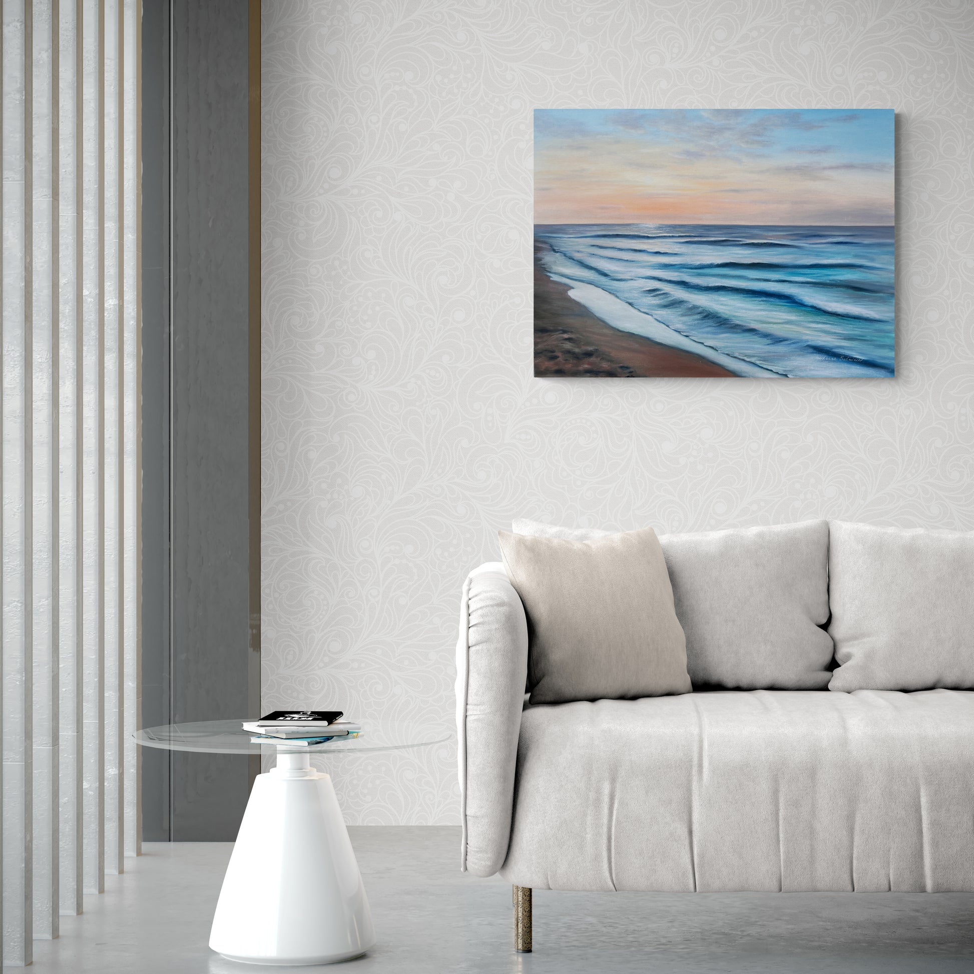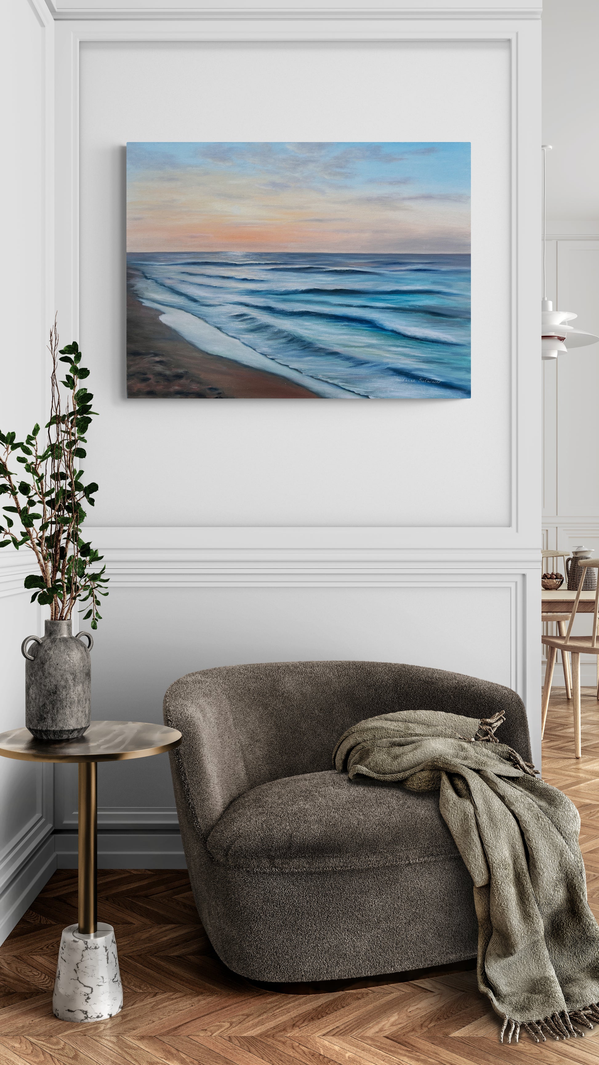 In crafting this seascape, I poured my heart into capturing the serene yet powerful essence of the ocean at sunset. The rolling waves and the subtle gradient of the sky reflect the tranquility and vastness of nature, inviting viewers into a moment of peace and reflection. This oil painting blends realism with touches of abstraction, emphasizing the fluidity and dynamic rhythms of the sea. It's designed to bring a calming, soothing atmosphere to any space, evoking feelings of being close to nature's expansive beauty.