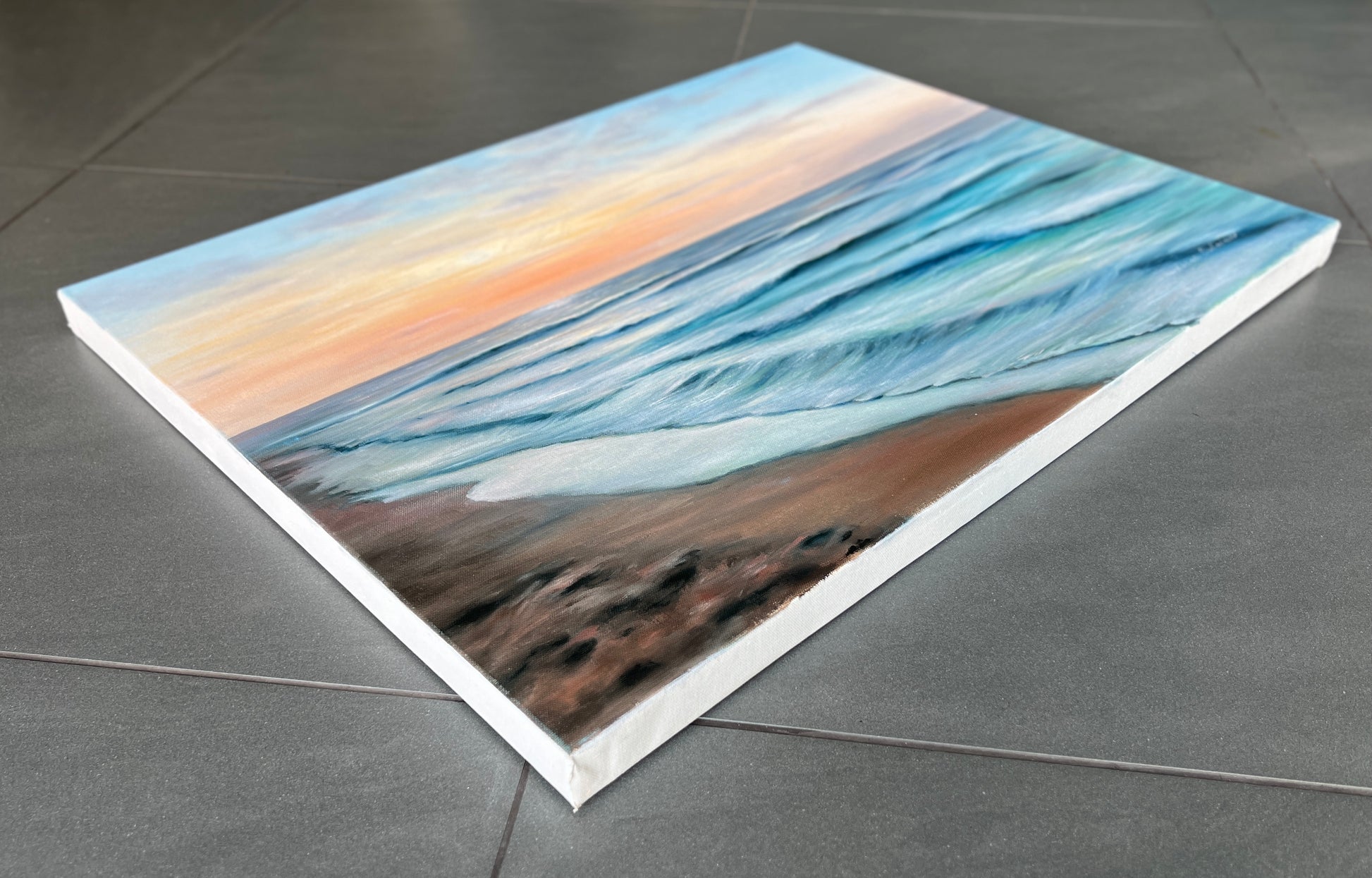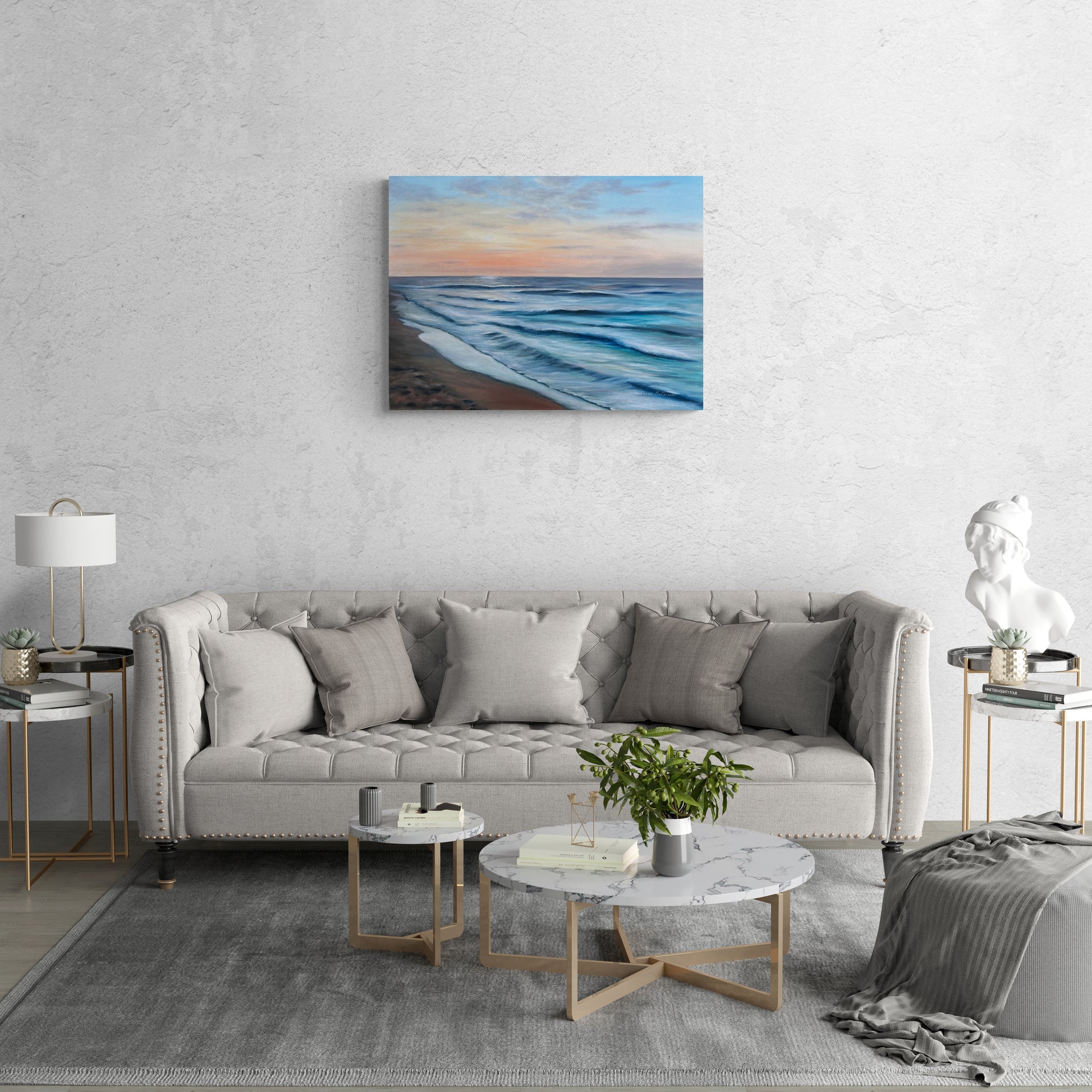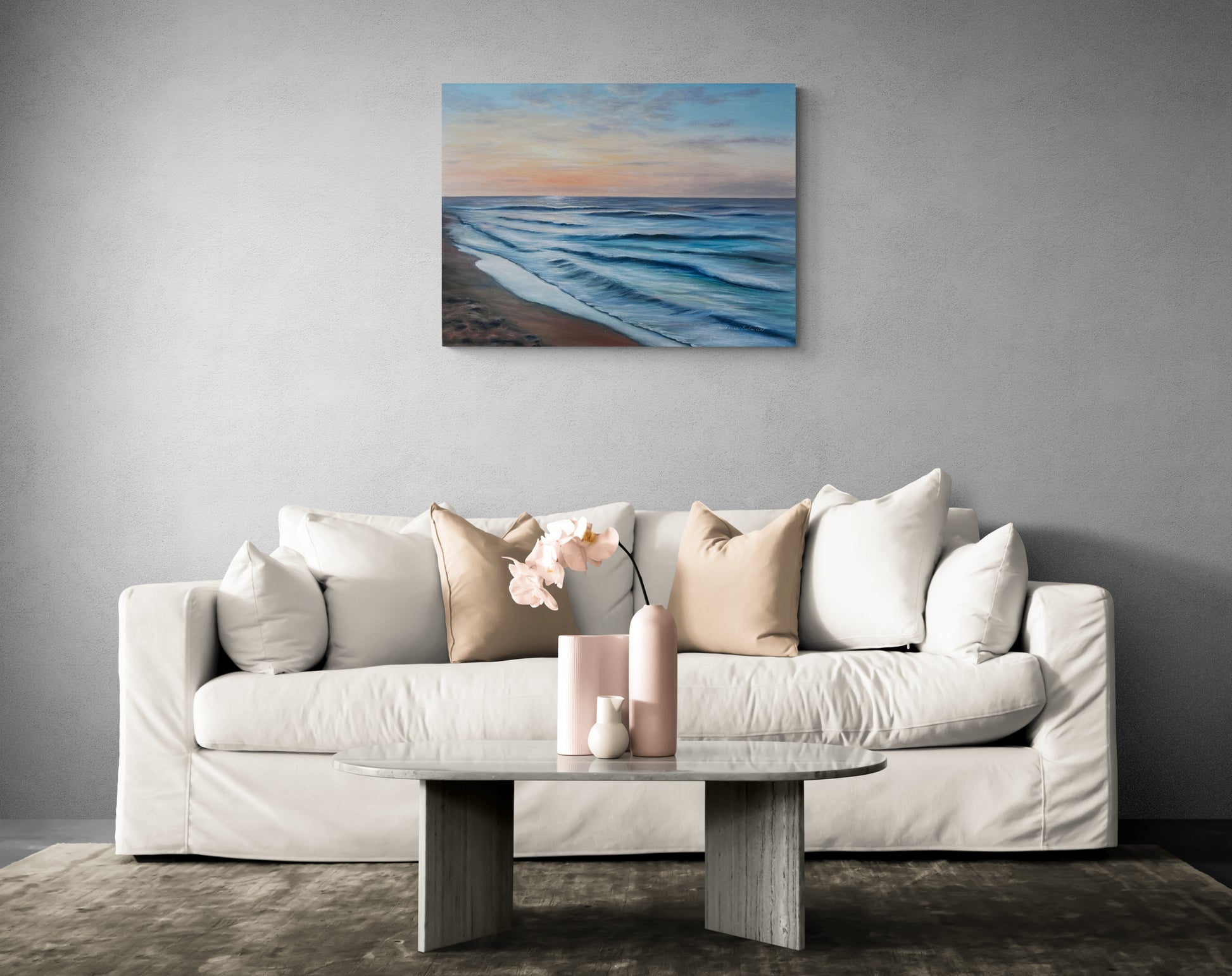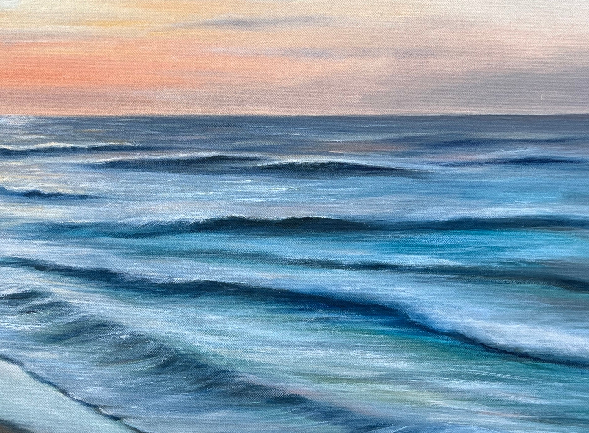 In crafting this seascape, I poured my heart into capturing the serene yet powerful essence of the ocean at sunset. The rolling waves and the subtle gradient of the sky reflect the tranquility and vastness of nature, inviting viewers into a moment of peace and reflection. This oil painting blends realism with touches of abstraction, emphasizing the fluidity and dynamic rhythms of the sea. It's designed to bring a calming, soothing atmosphere to any space, evoking feelings of being close to nature's expansive beauty.