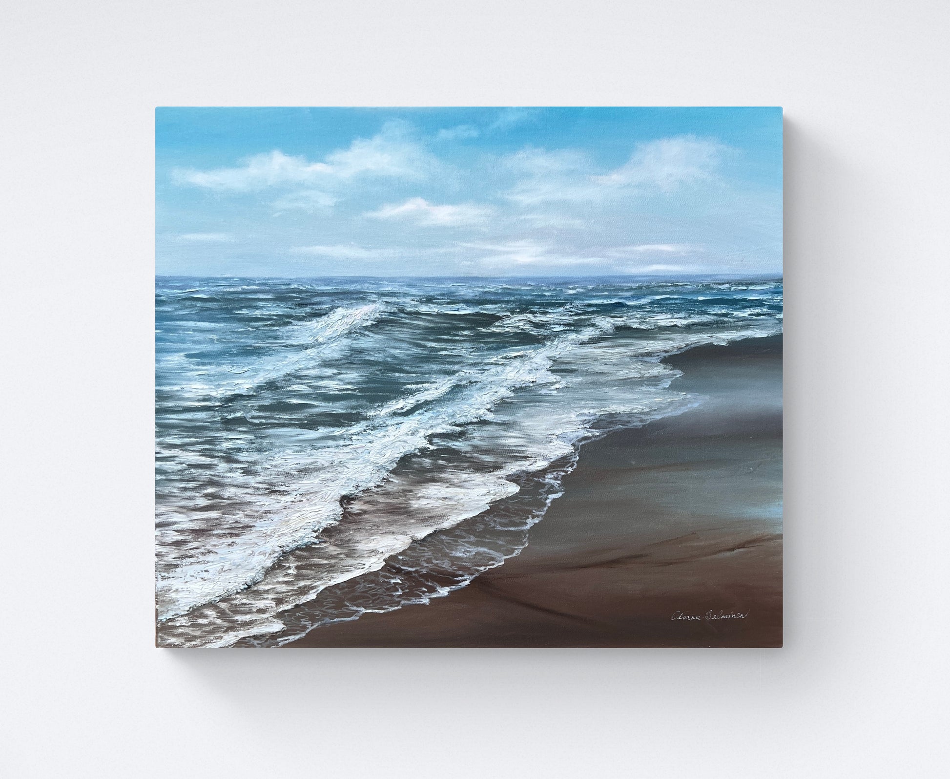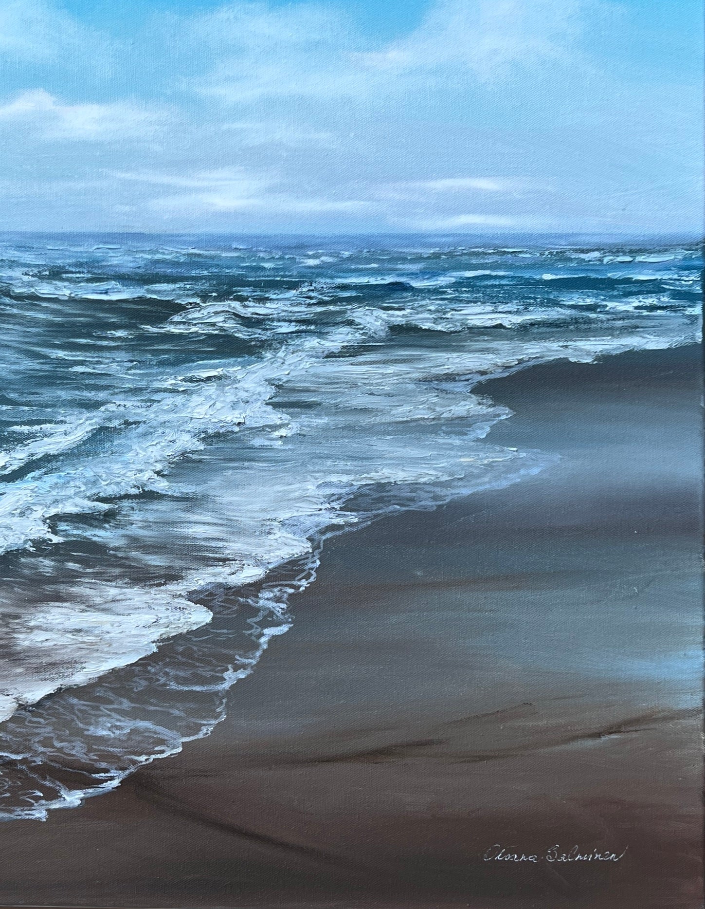 In creating this artwork, I immersed myself in the dance of the Baltic shore. Across the canvas, the merger of mystic blues and earthy browns captures the coast's untamed spirit and whispering winds. This painting, executed in oils through an impressionistic lens with touches of realism, conveys nature's gentle yet relentless force, offering serenity and depth to any space it inhabits. Its presence in a home brings a breath of cool, fresh air, echoing the quiet strength of the sea.