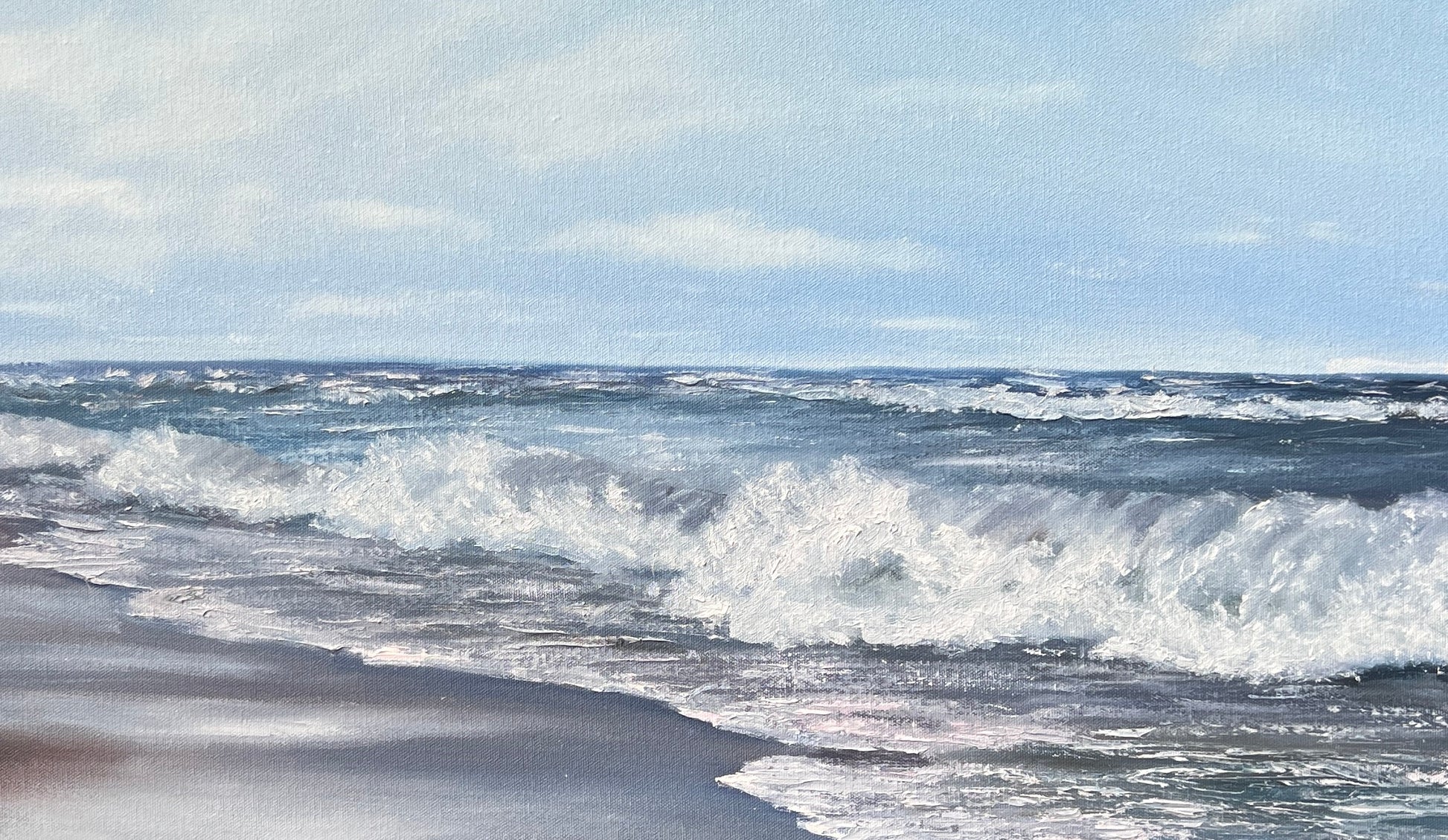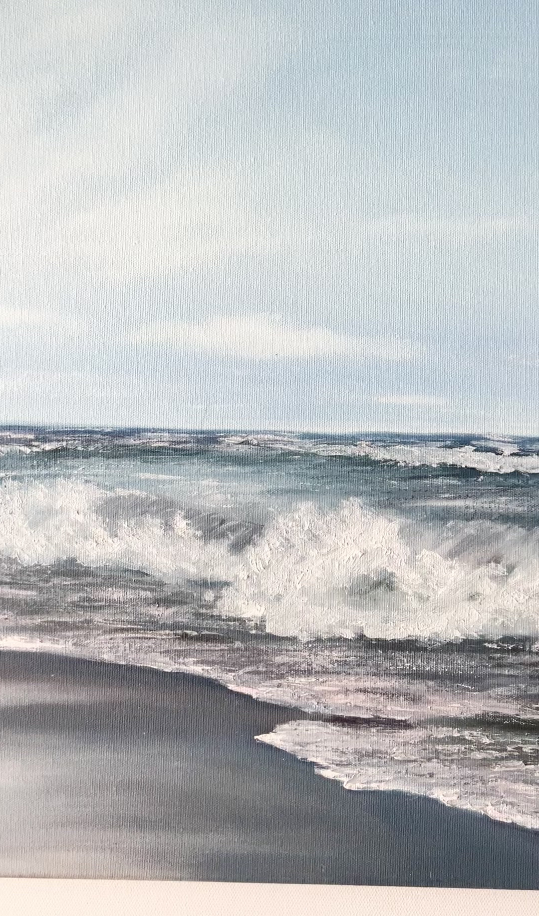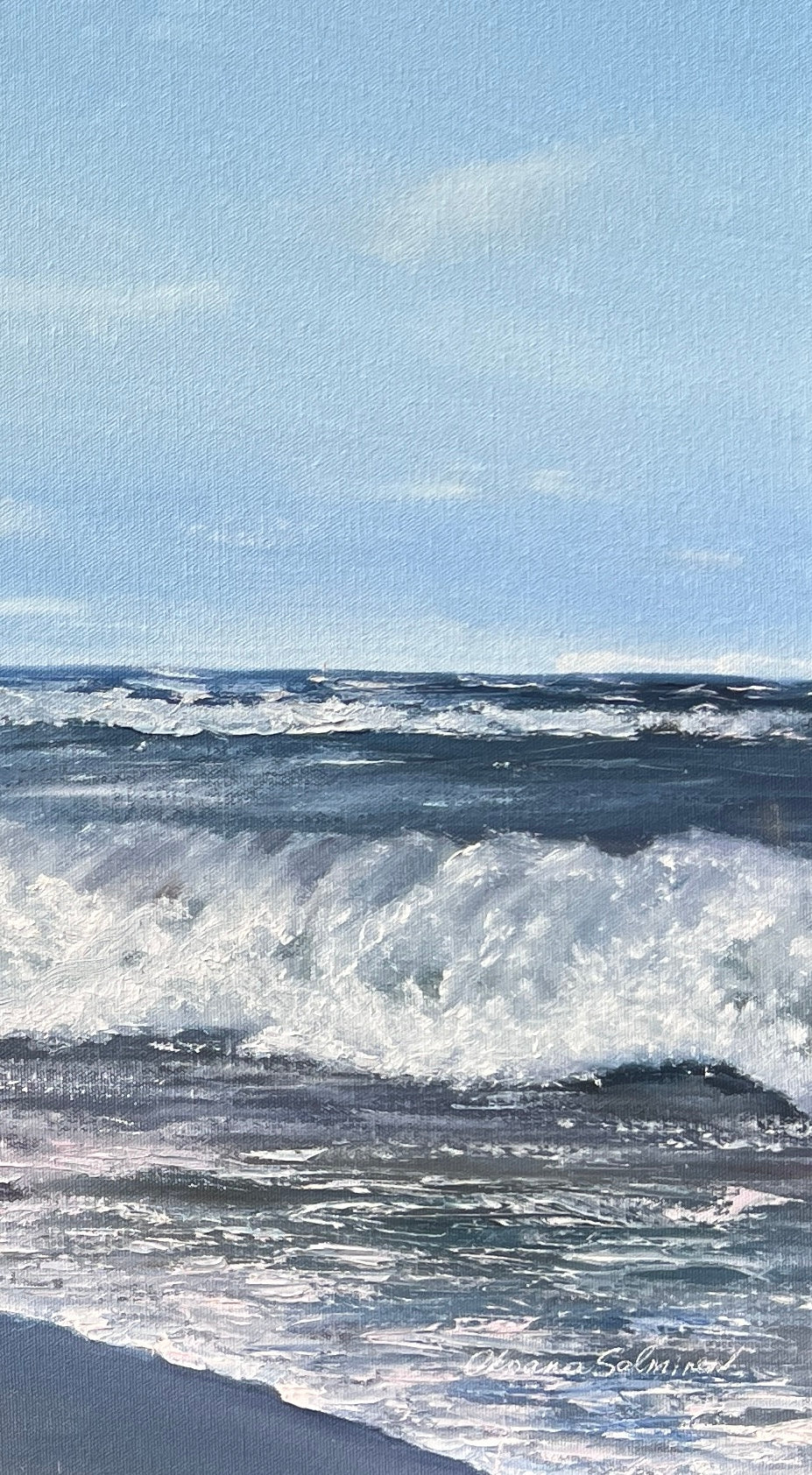 In this painting, I've illustrated the glorious, untouched beauty of the sea. The play of oils captures the fierce energy of the waves and the reflective perspectives of the skies. My brushstrokes balance realism and impressionism, inviting viewers to sense the sea's roar and serenity. This piece embodies the power of nature and its calming embrace, entirely balancing visual energy and tranquility for any space.