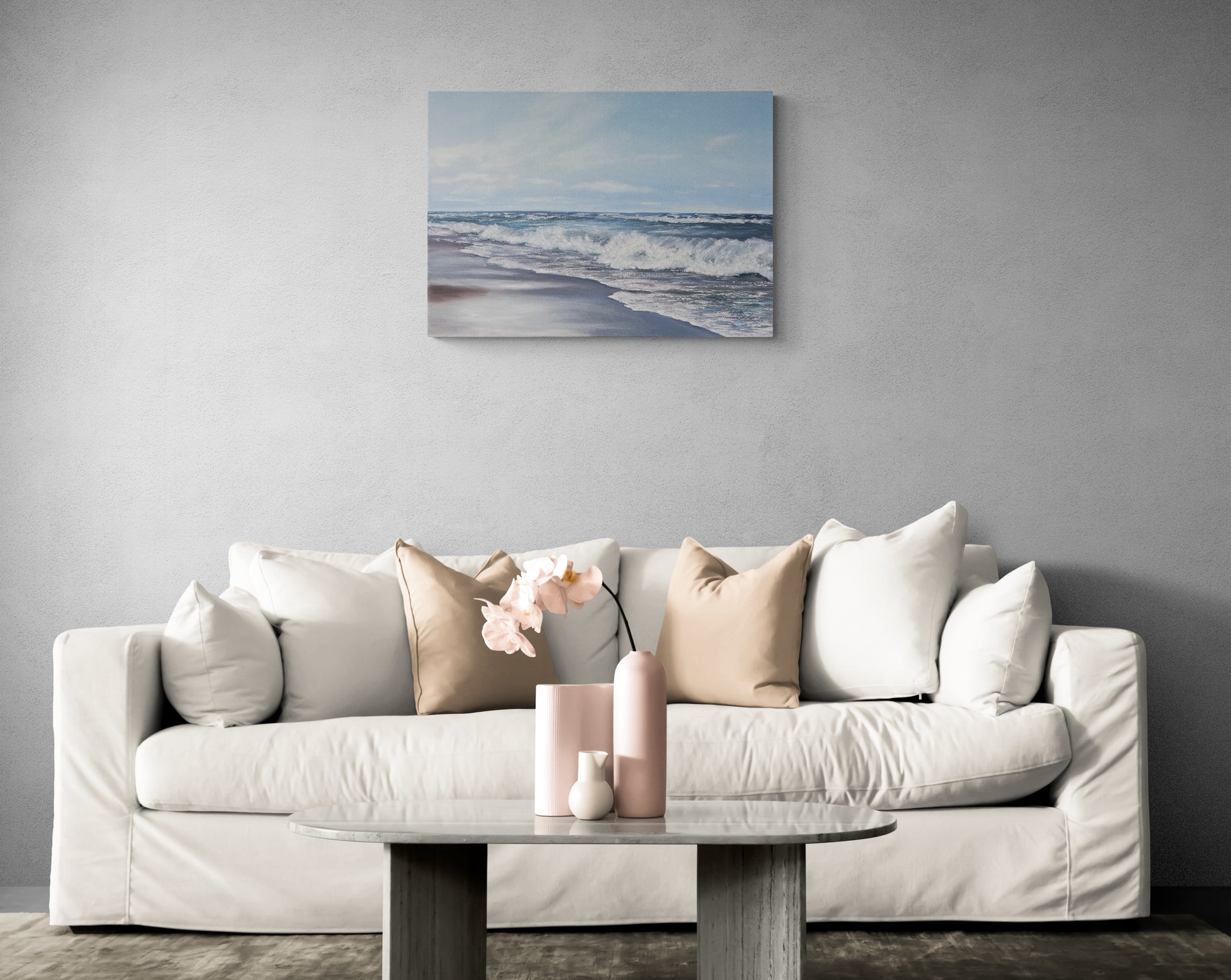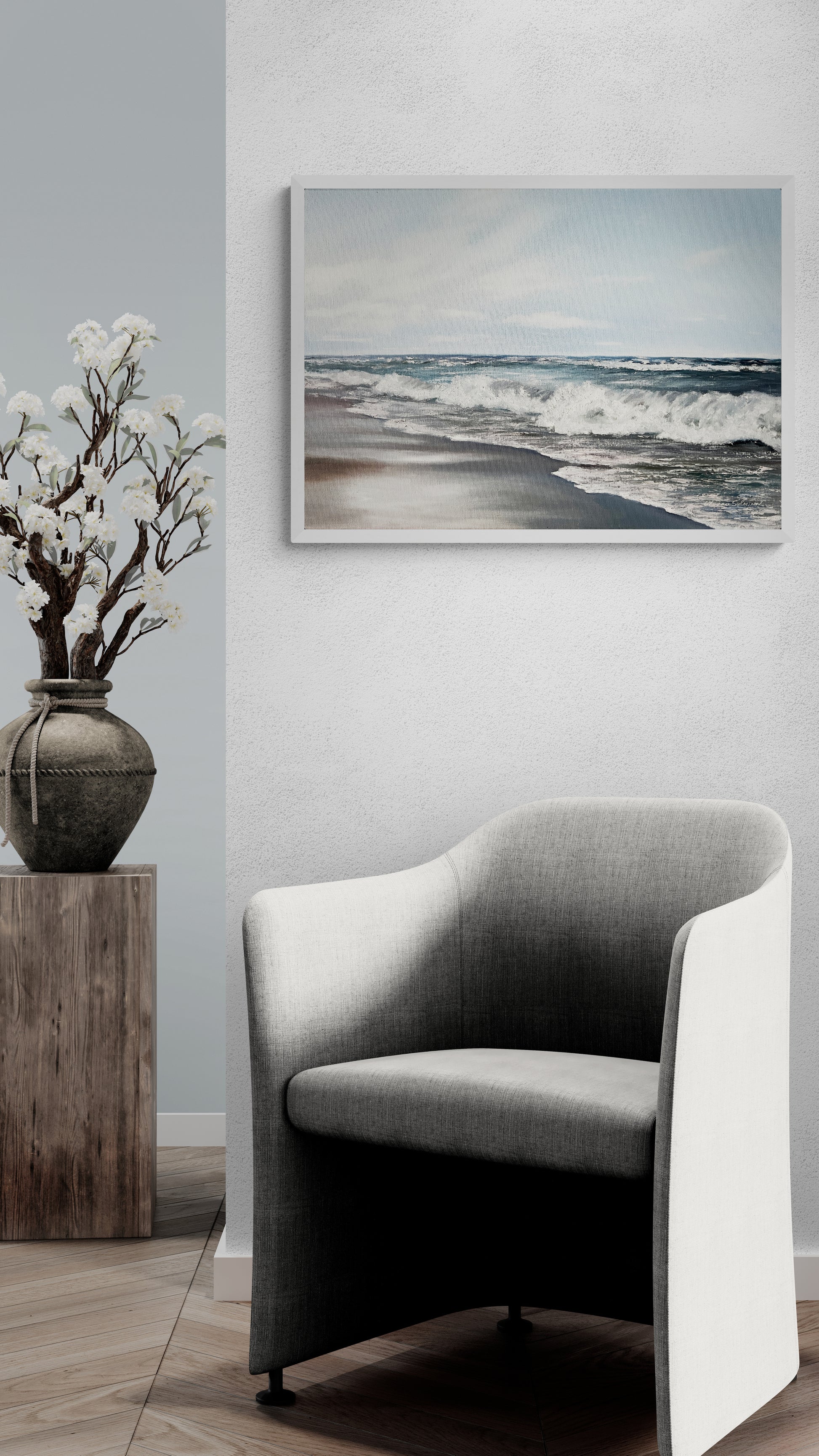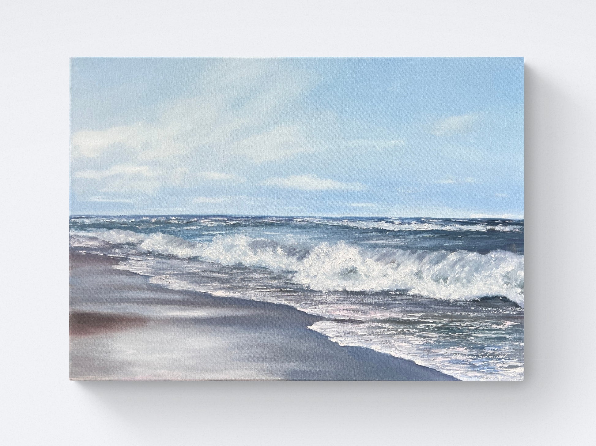 In this painting, I've illustrated the glorious, untouched beauty of the sea. The play of oils captures the fierce energy of the waves and the reflective perspectives of the skies. My brushstrokes balance realism and impressionism, inviting viewers to sense the sea's roar and serenity. This piece embodies the power of nature and its calming embrace, entirely balancing visual energy and tranquility for any space.