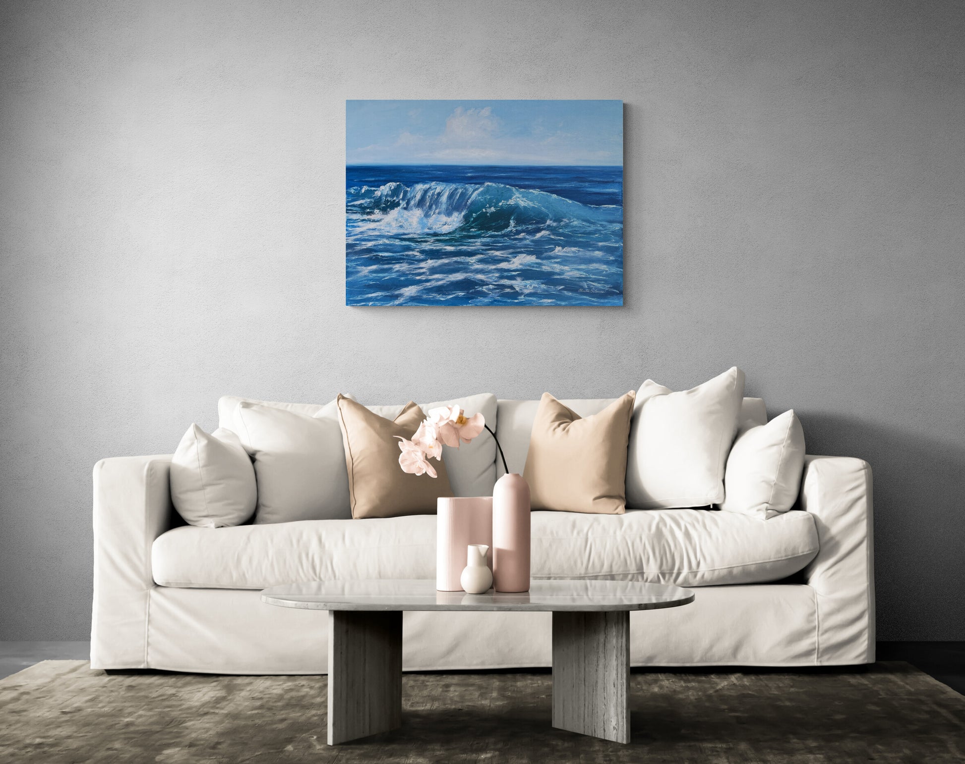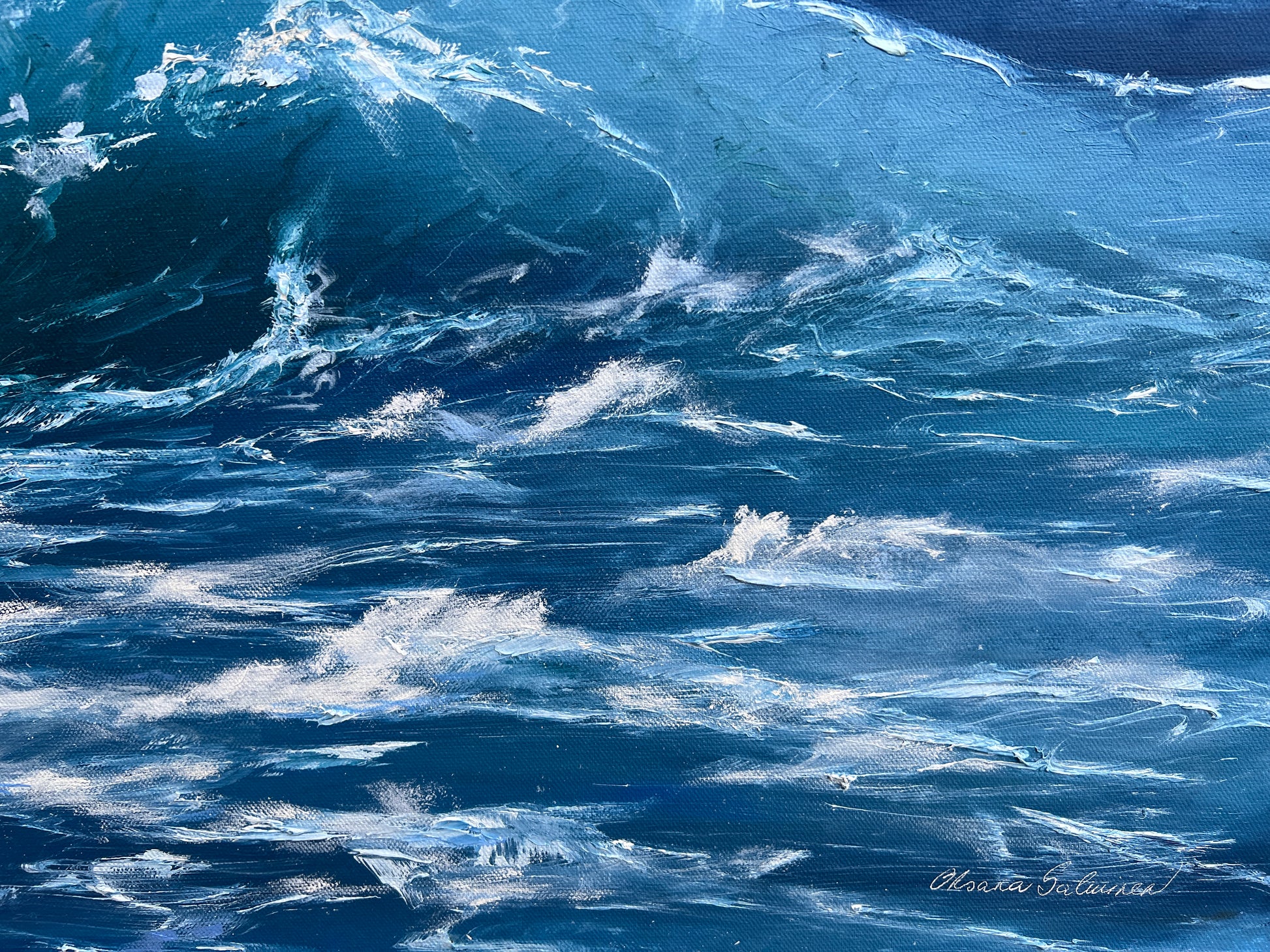 This artwork blends impressionism and realism to capture the ocean's raw energy and emotions. The dynamic brushwork and active waves reflect its fluctuating moods, while the towering wave symbolizes life's highs and lows. This piece invites viewers to connect with the powerful essence of nature, filling the space with vibrant energy.