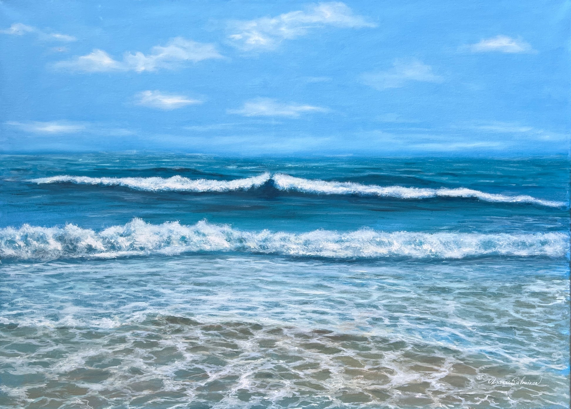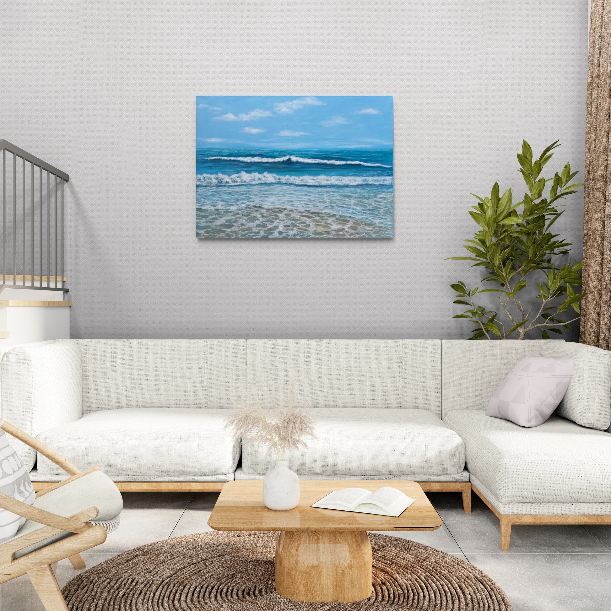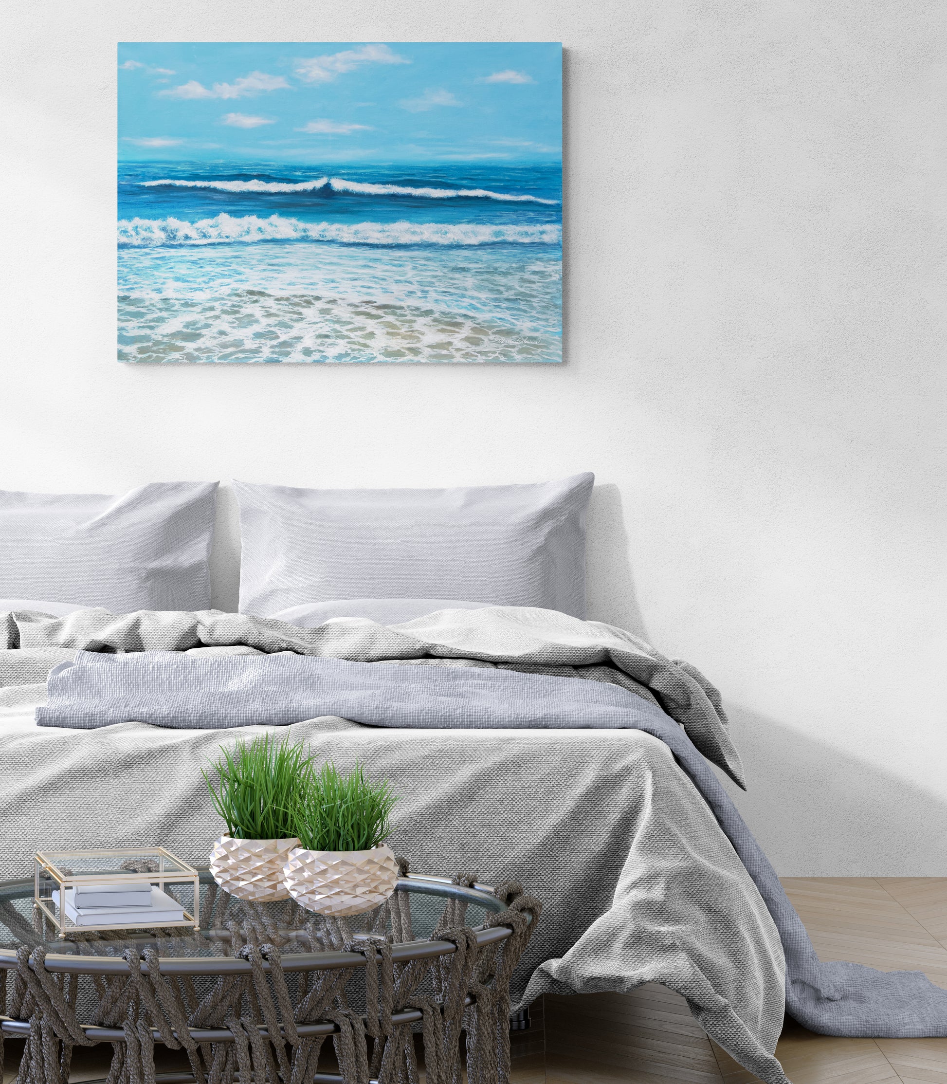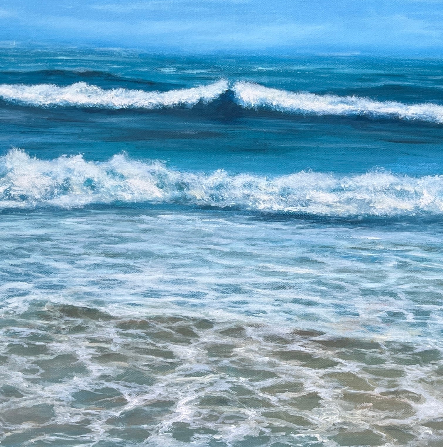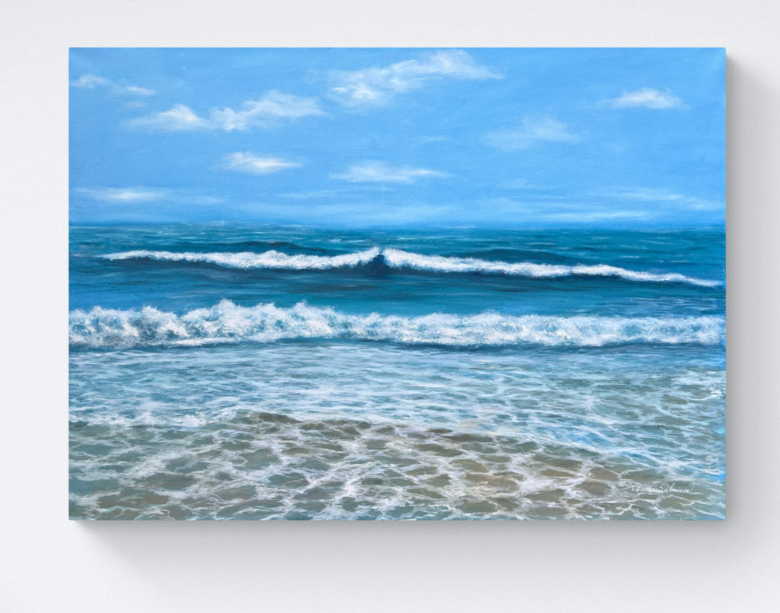In this painting, I've captured the relentless motion of the sea, where shades of deep and vibrant blues mingle with whites to depict the waves rolling ashore. Realism meets the abstract in the fluidity of the water's movement, while fine art echoes in the precise rendering of sea foam and currents. This artwork embodies the power and serenity of the water, bringing a calming yet invigorating energy into any room.