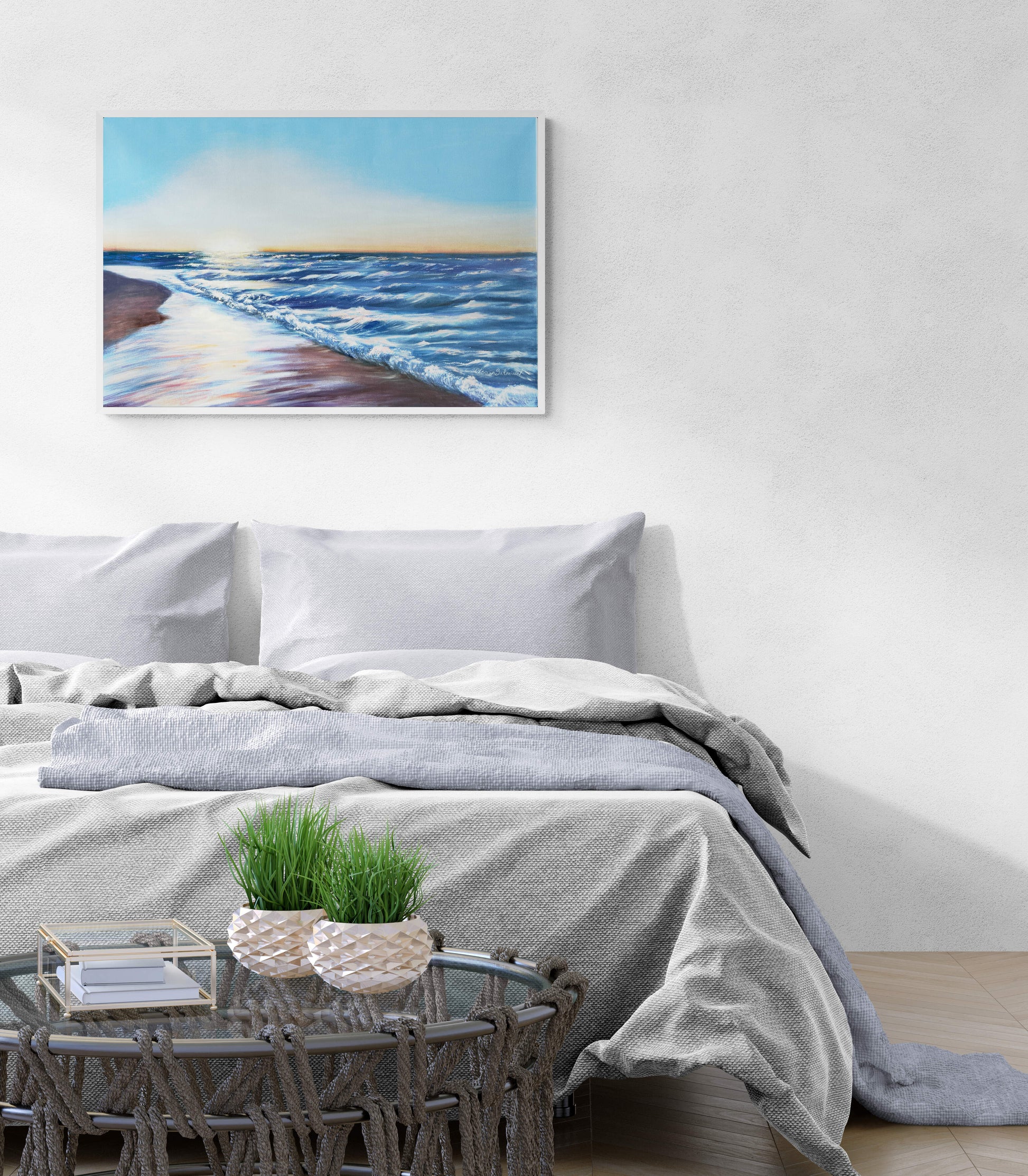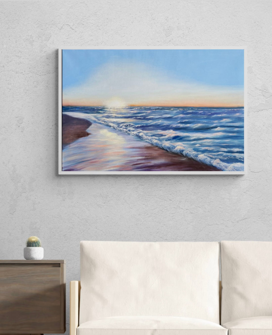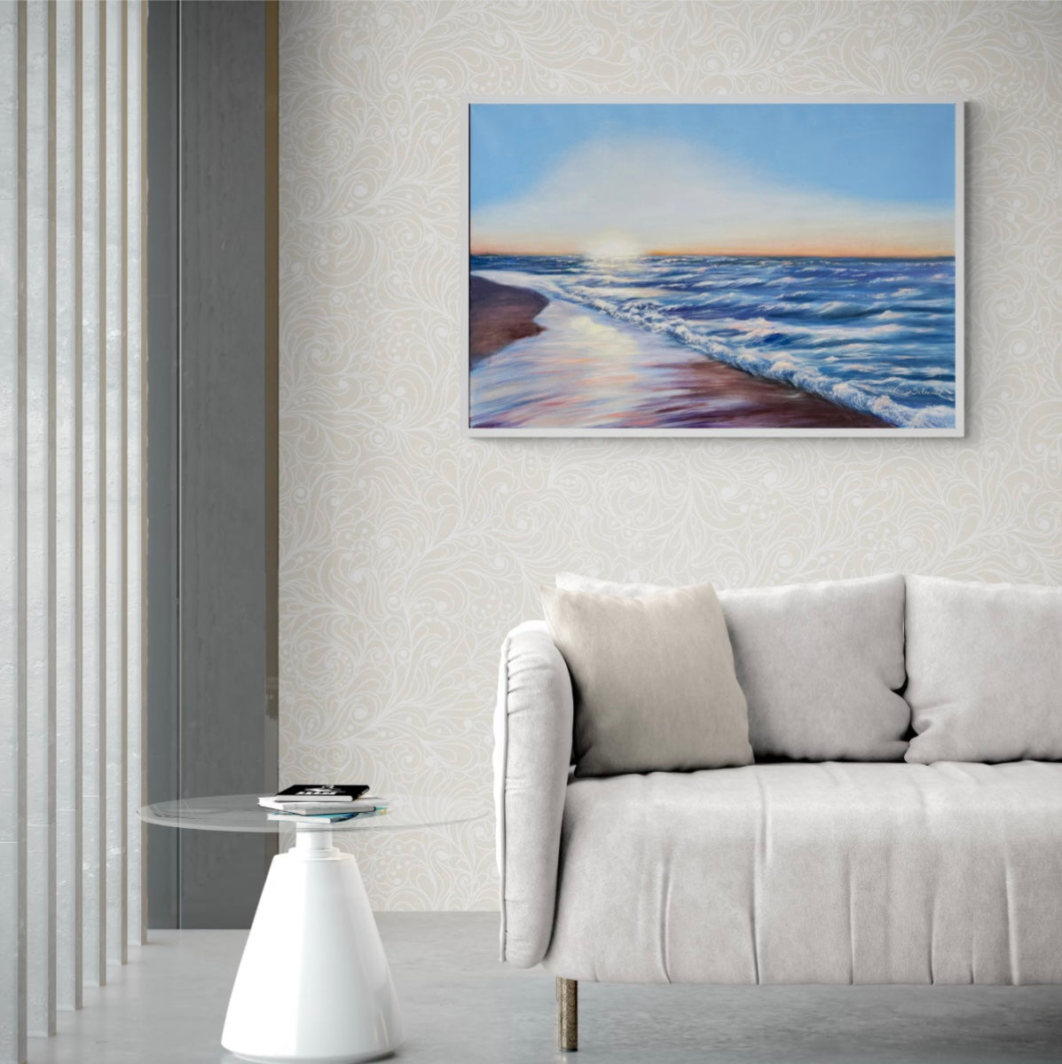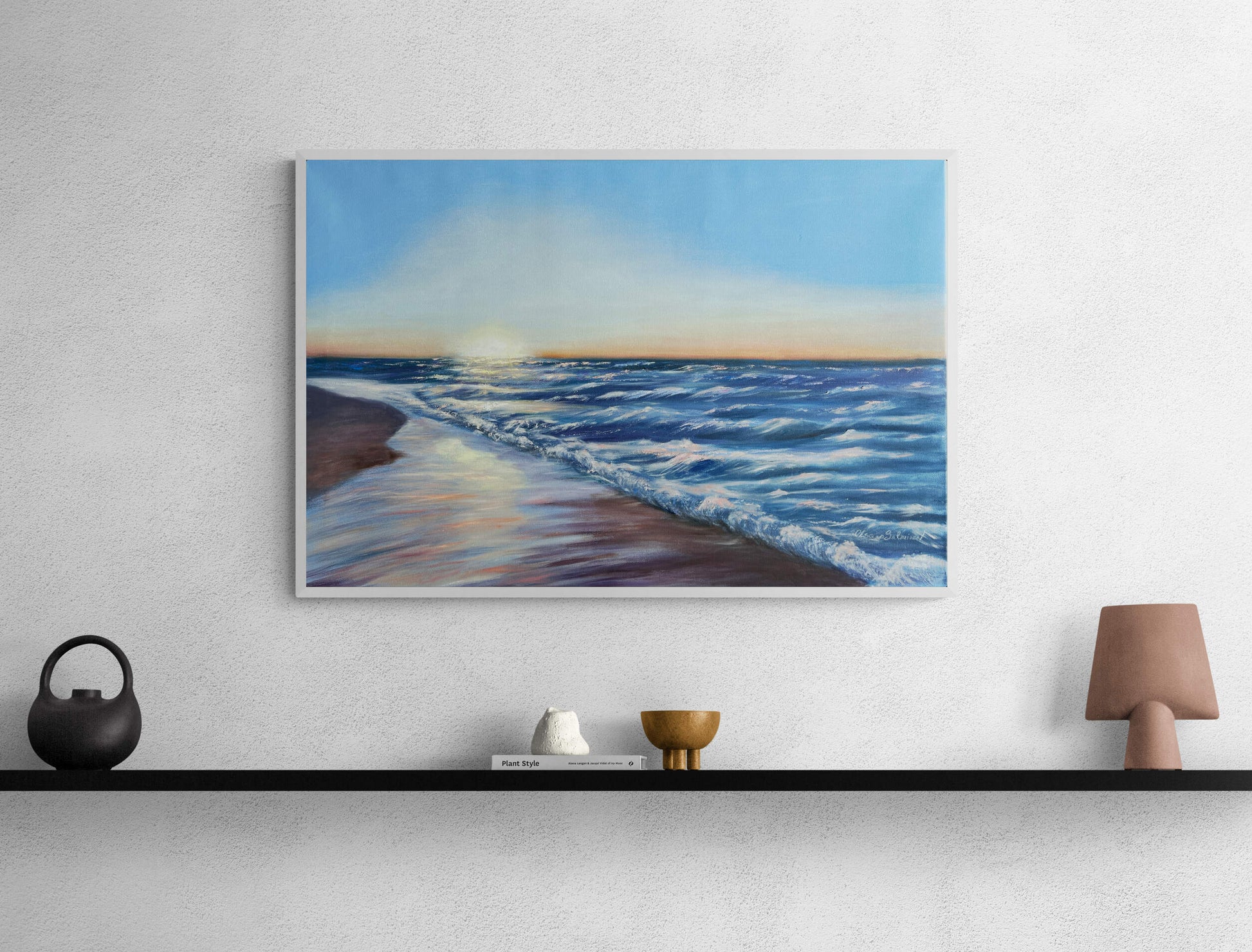 The original oil painting is on canvas, and the seascape is abstract and sophisticated.