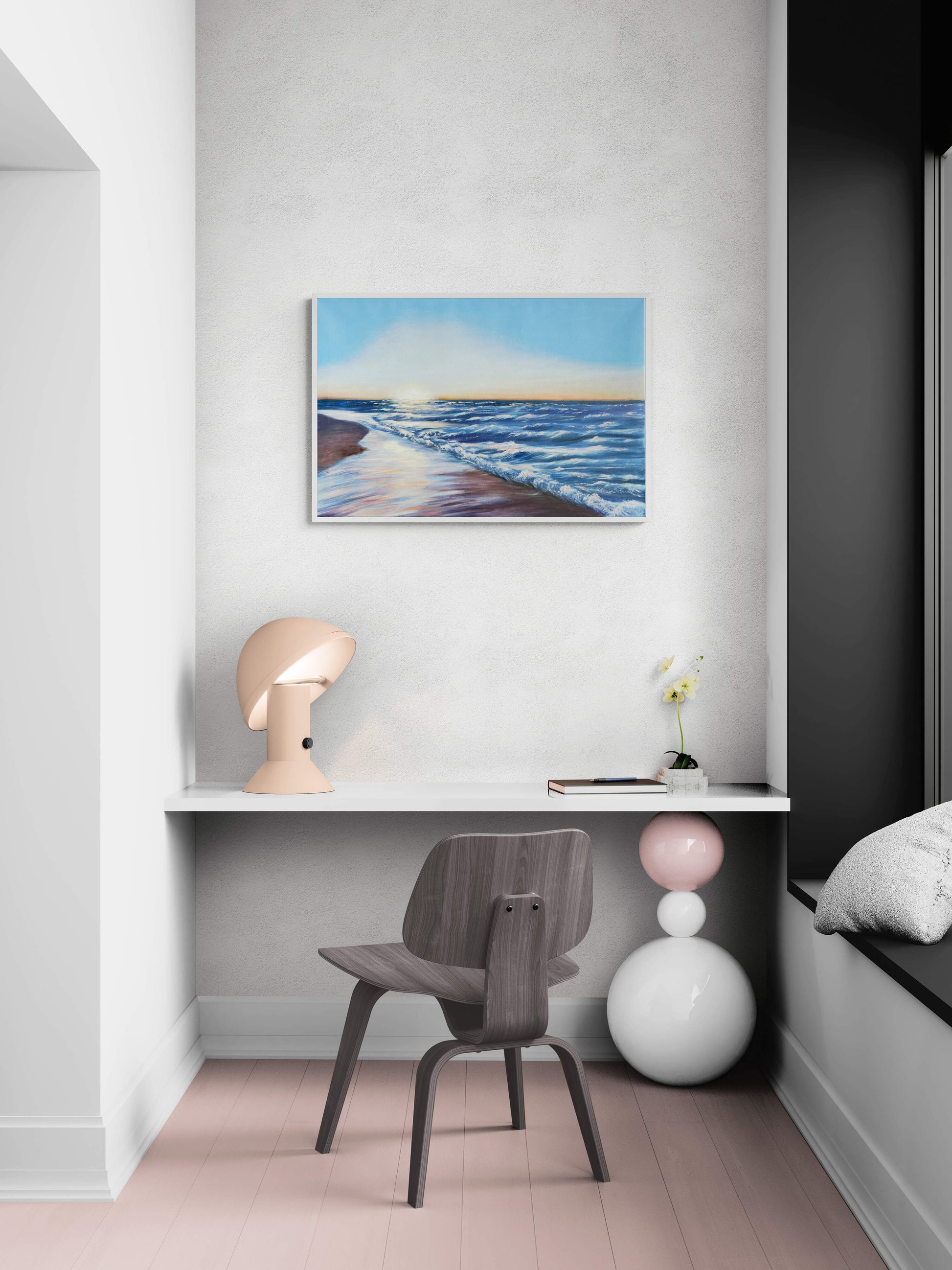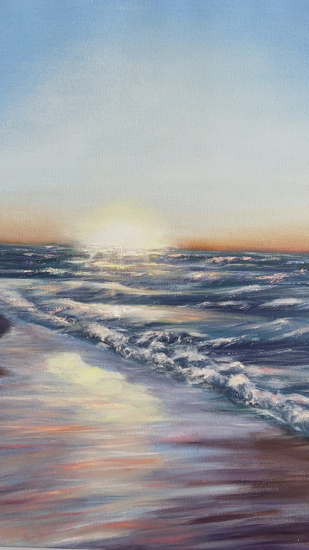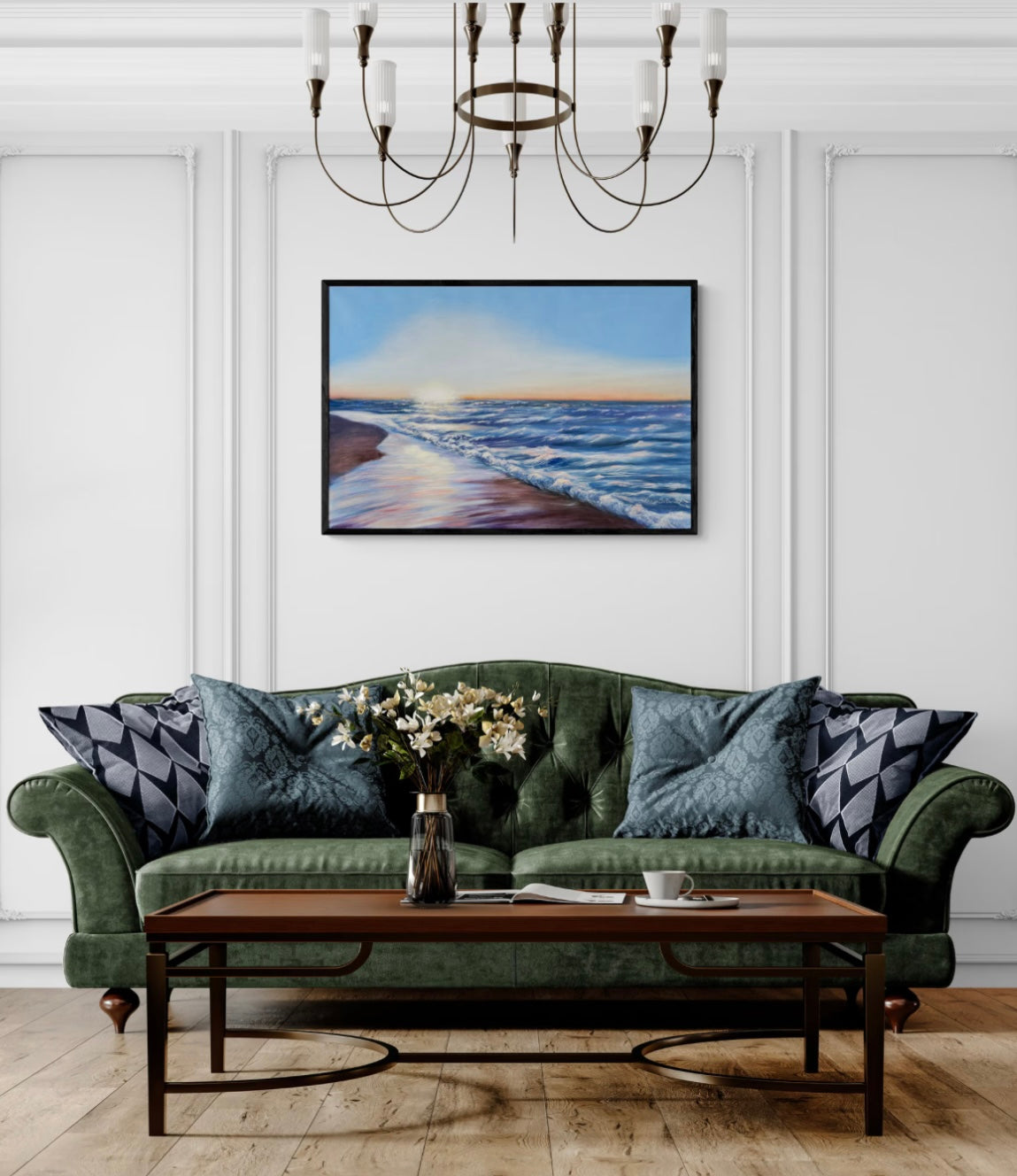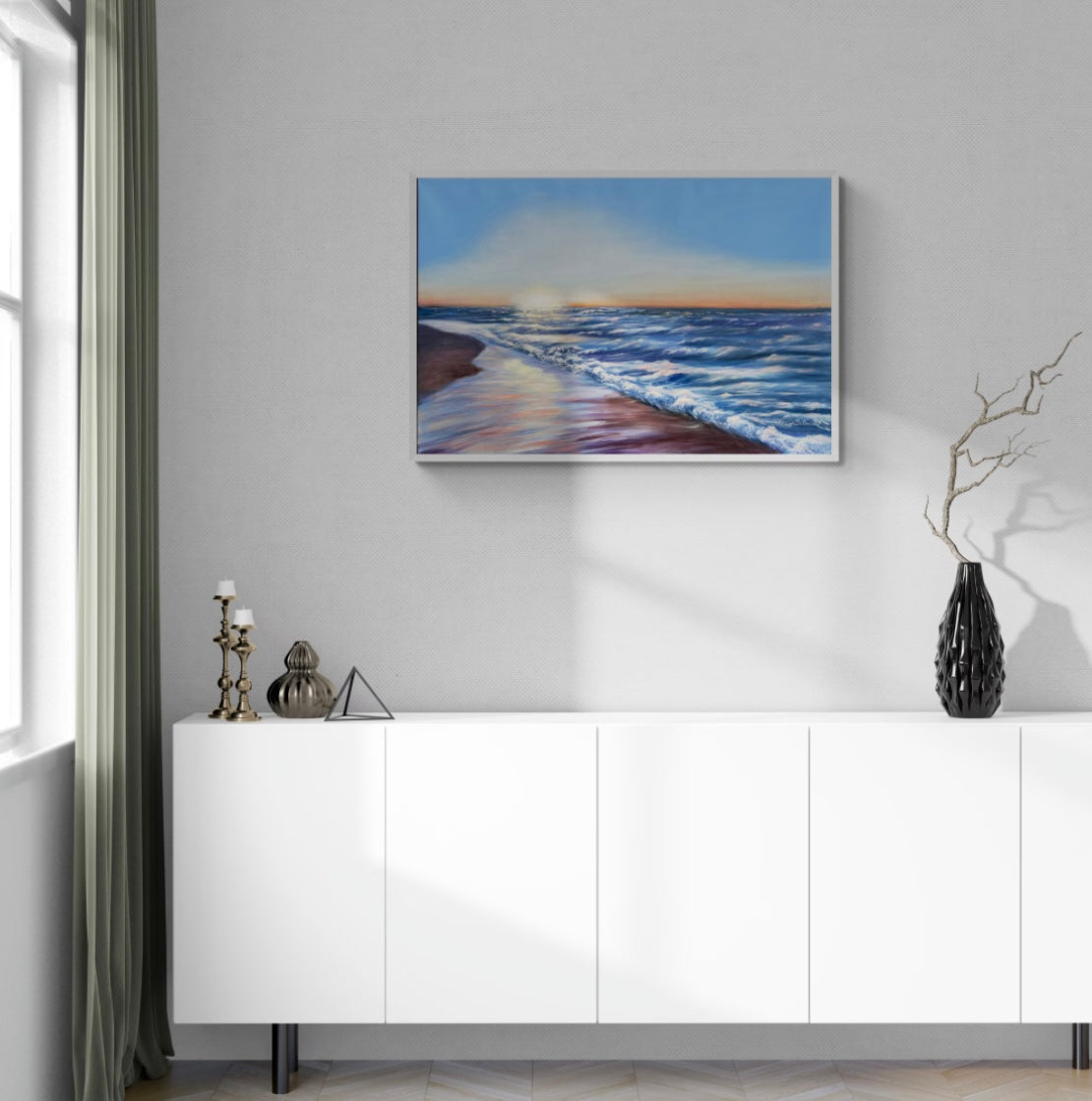 The original oil painting is on canvas, and the seascape is abstract and sophisticated.