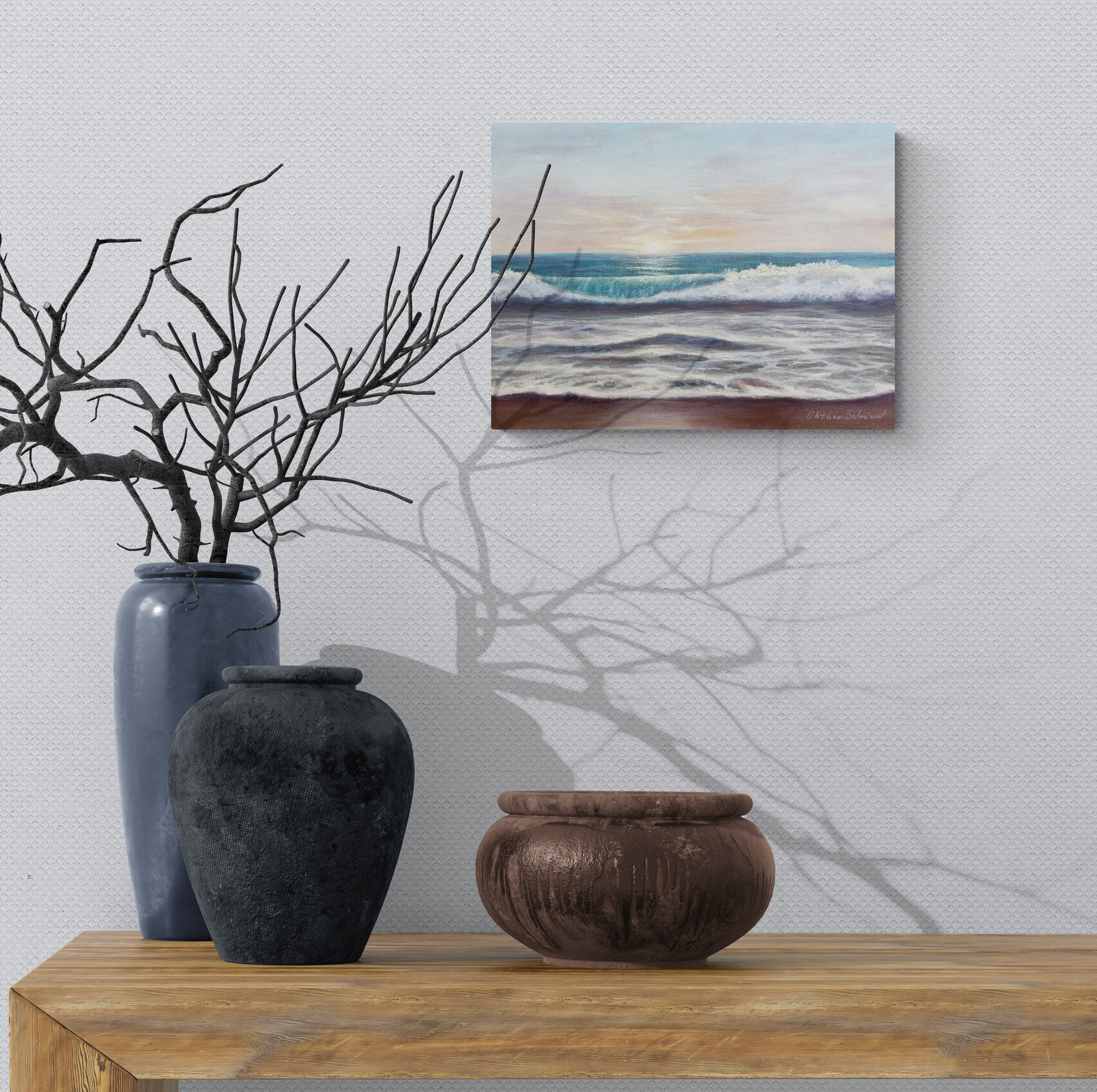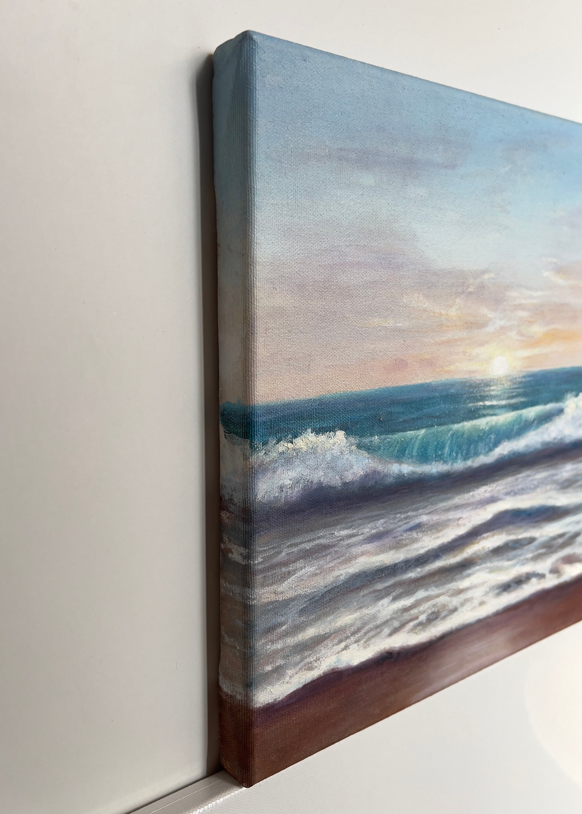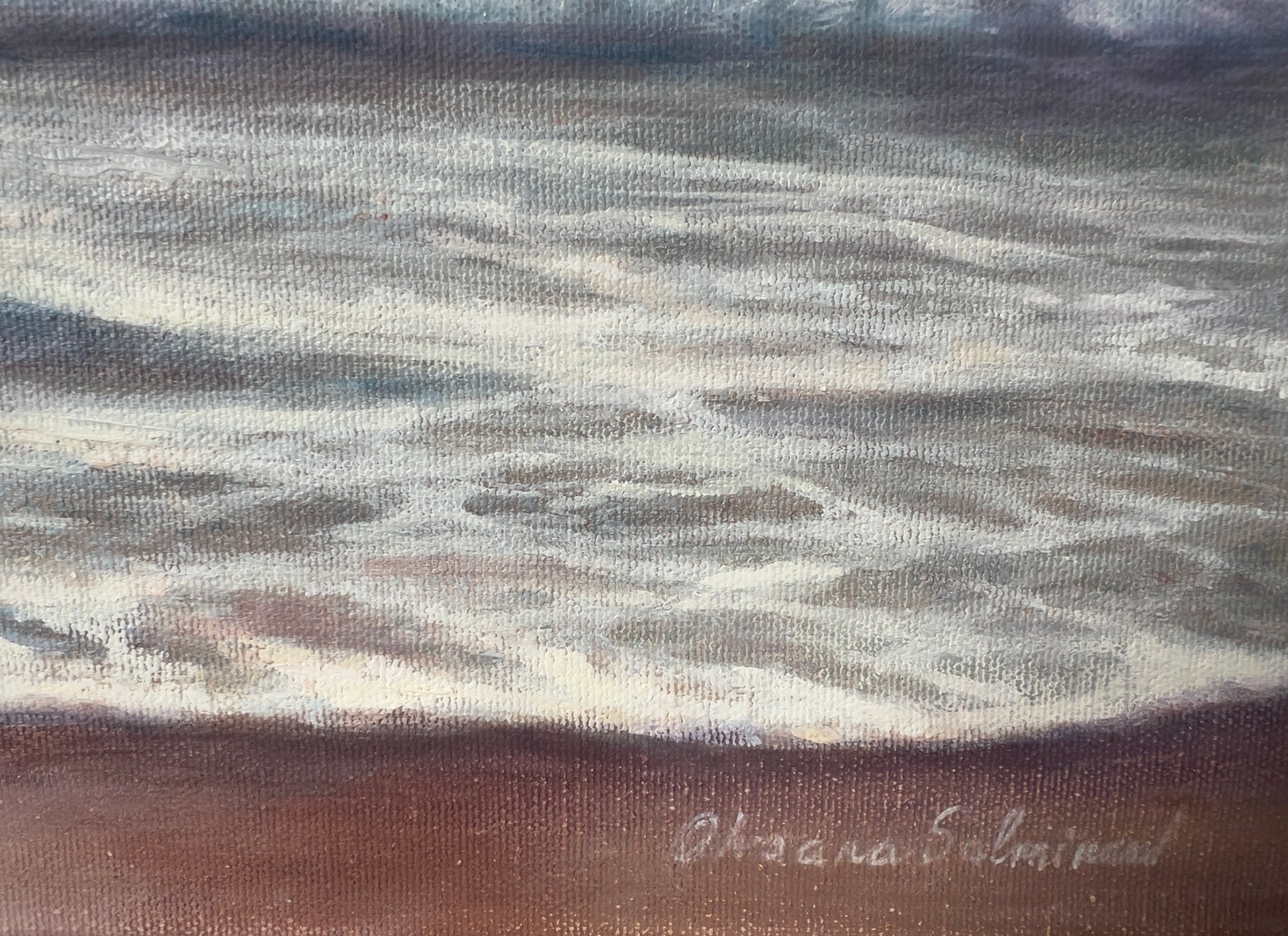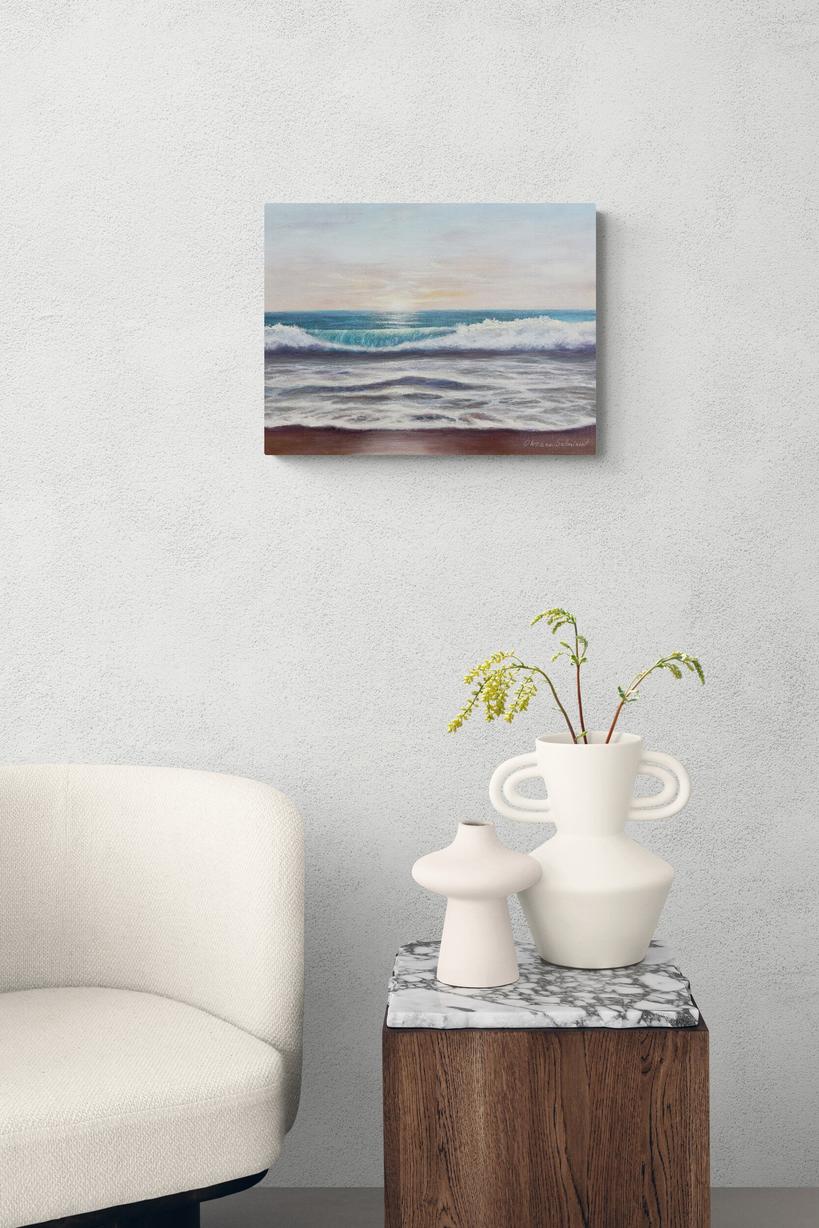 Painted in oils, the work reveals rich depth and a tactile surface that enhances the sense of motion. Rather than portraying calmness, Ocean No I immerses the viewer in the dramatic beauty of the ocean’s power, making the piece a striking visual anchor within any contemporary space.