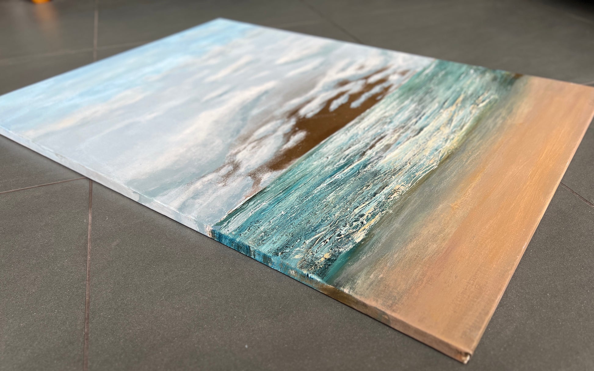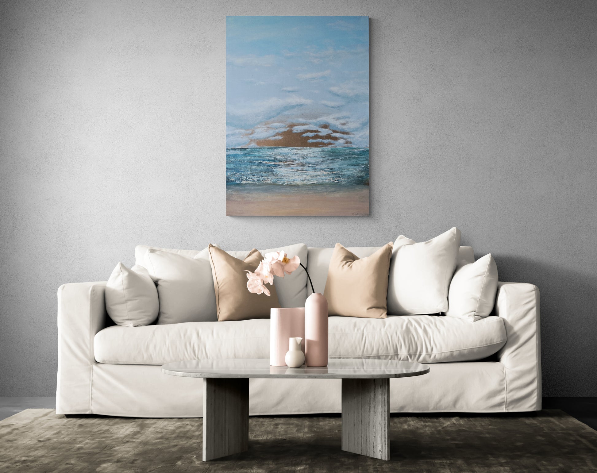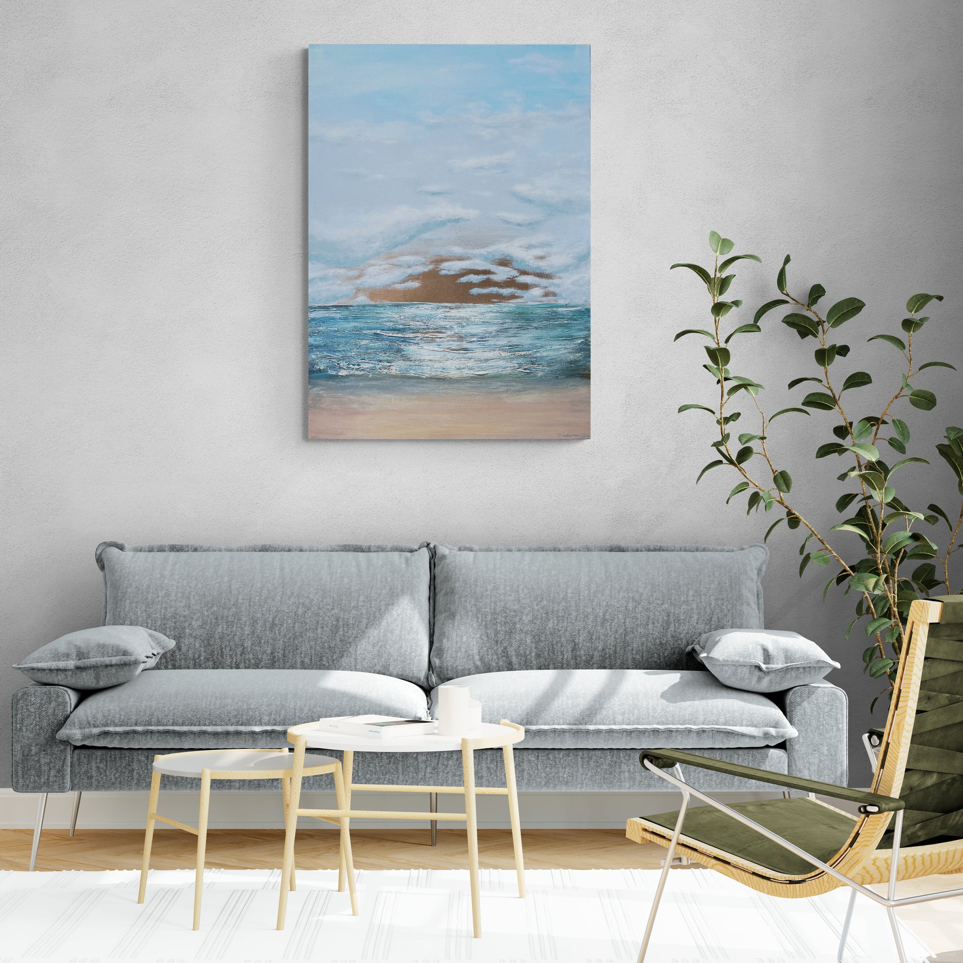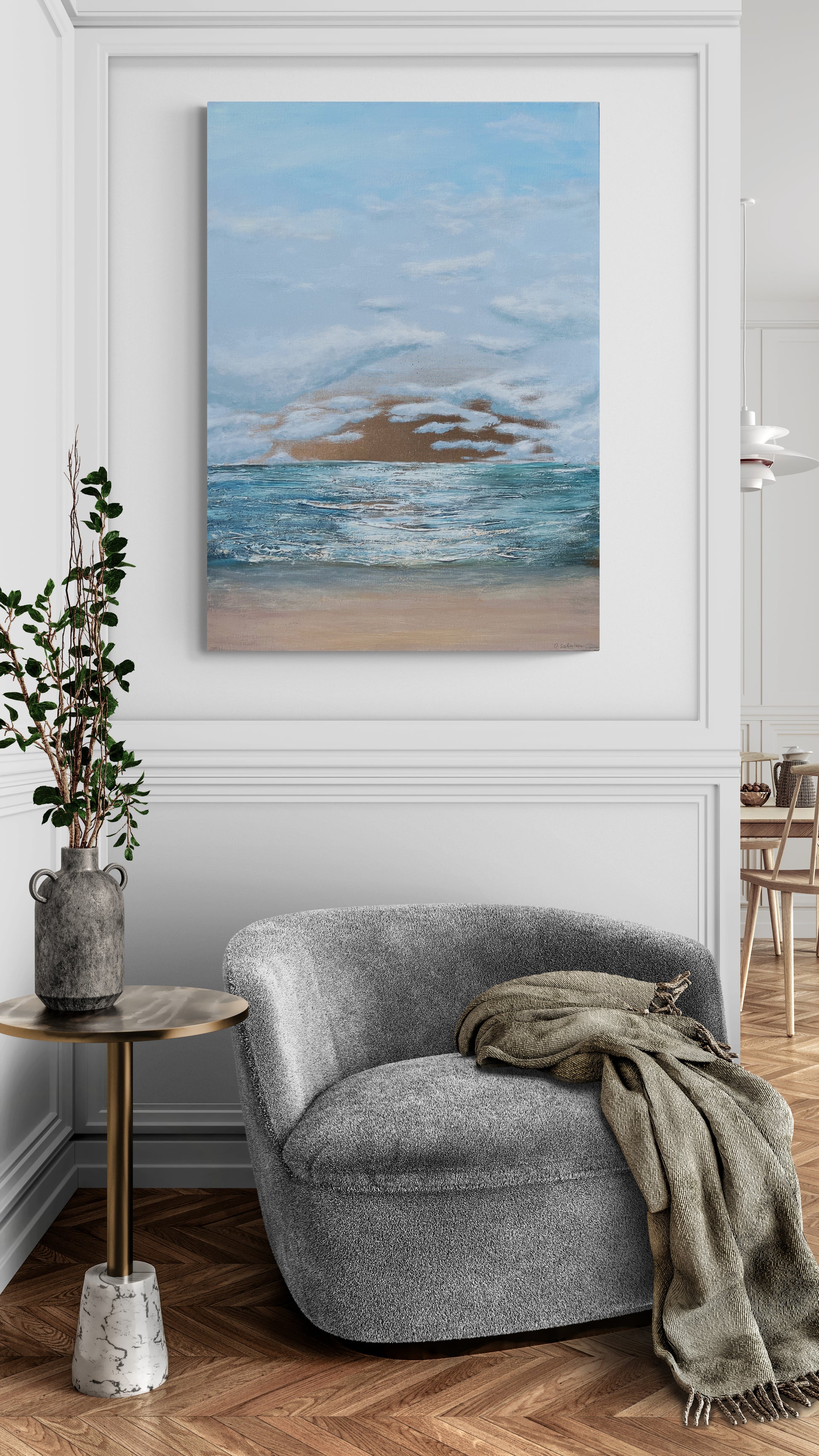 A warm and shiny sun is rising in the clouds. This beautiful and sophisticated painting will bring elegance and a touch of art to any interior.