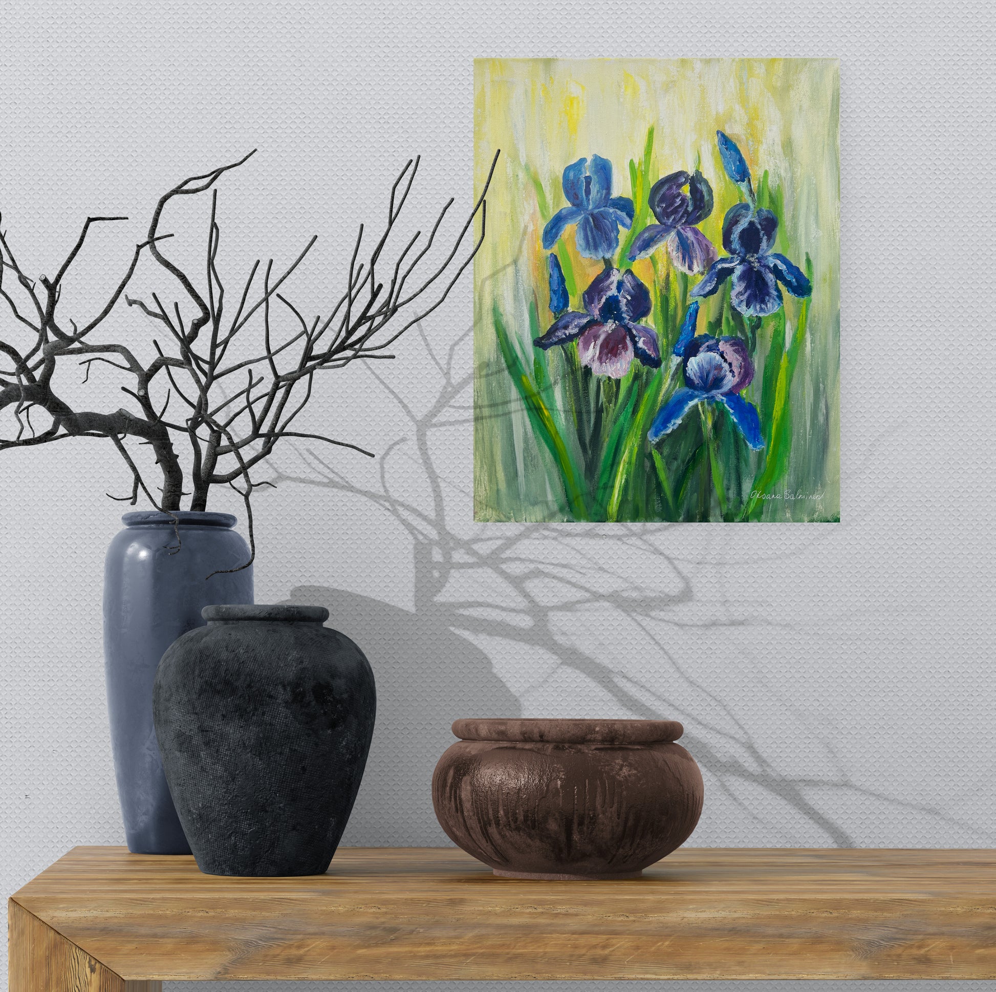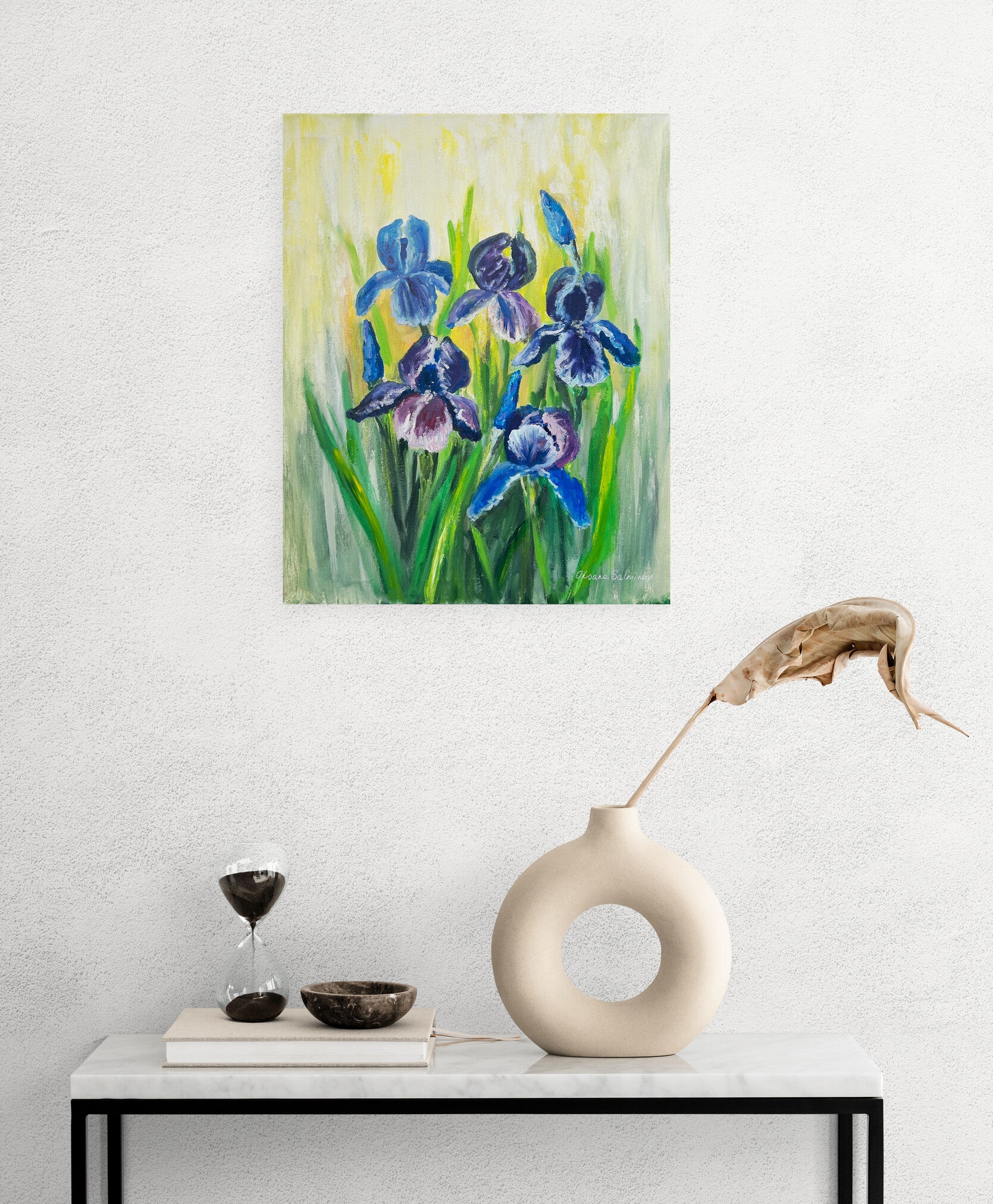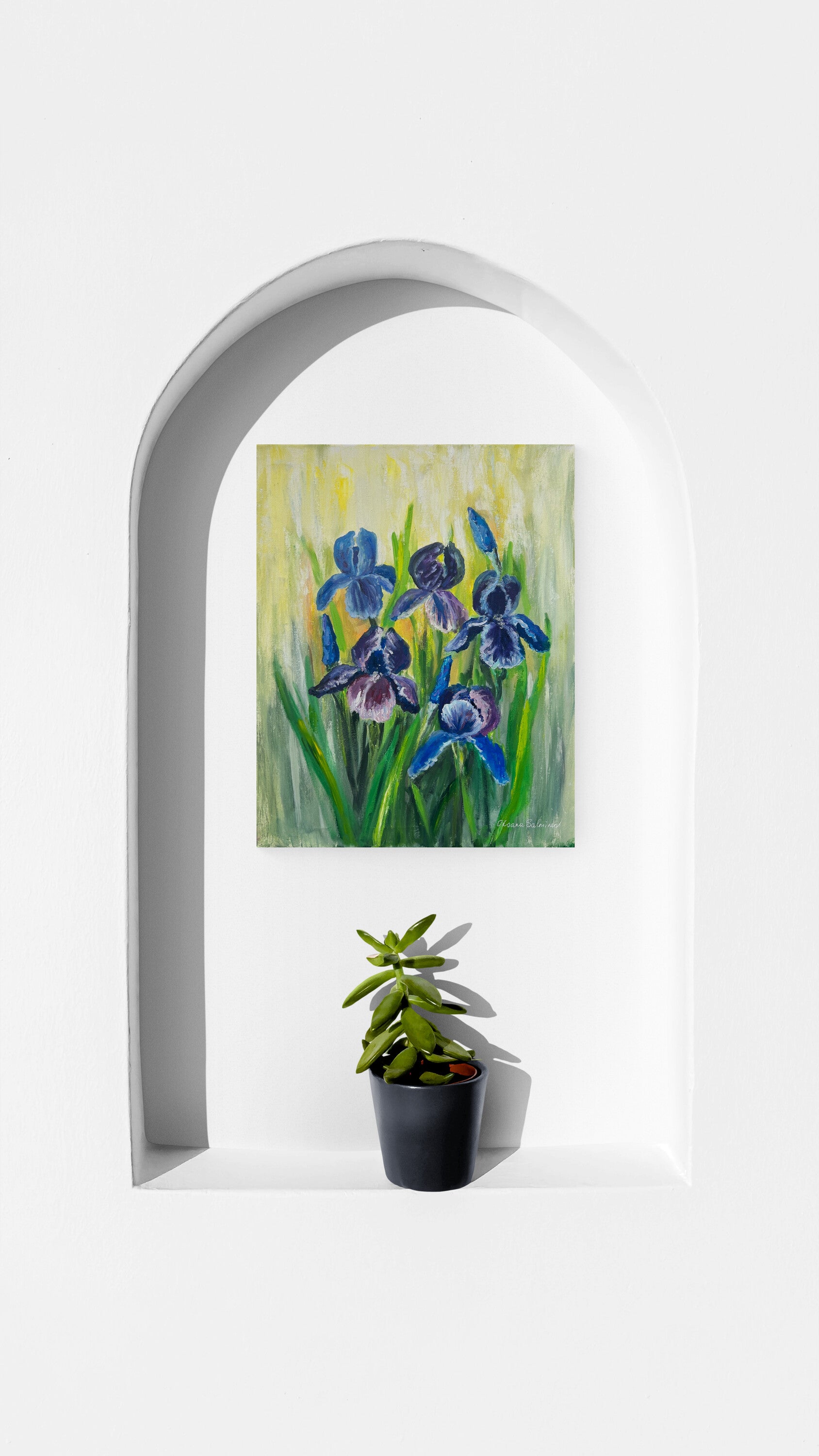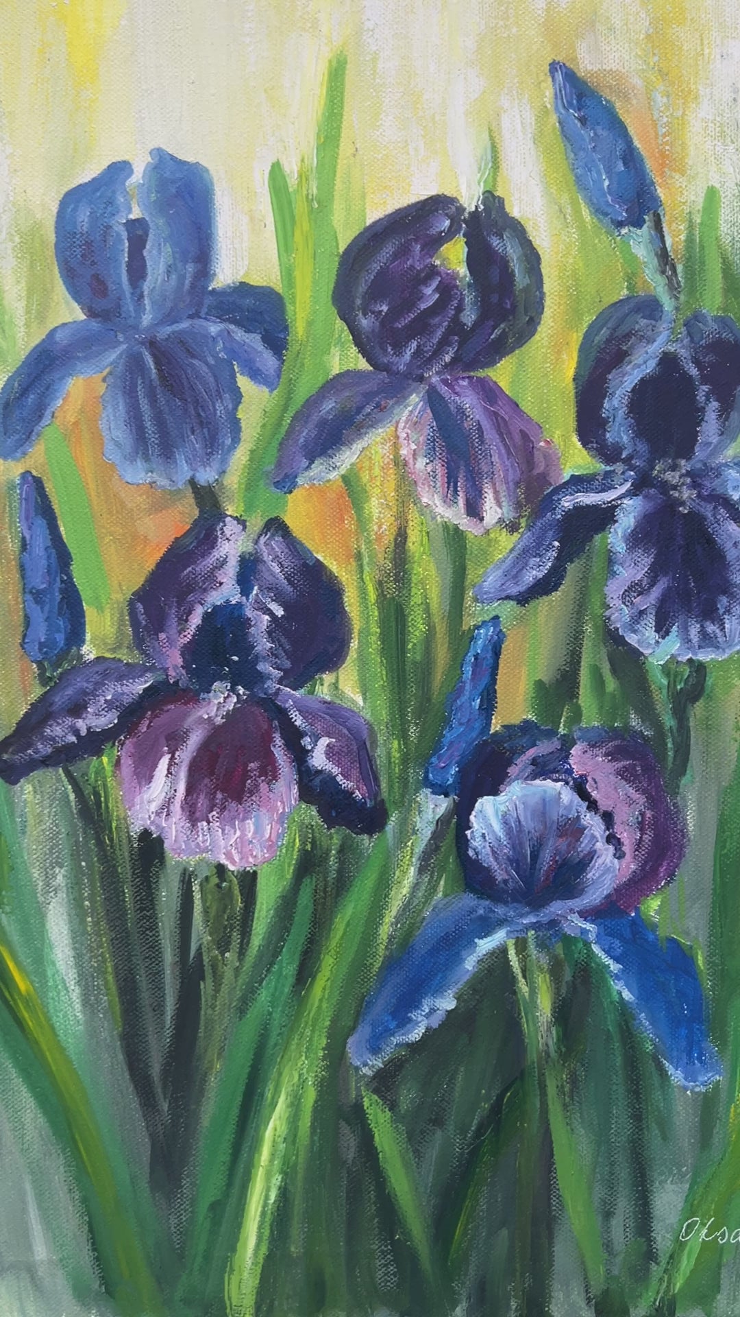 Original oil impasto painting on canvas "Sunny Irises" the luxurious and sophisticated beauty of blooming iris flowers.