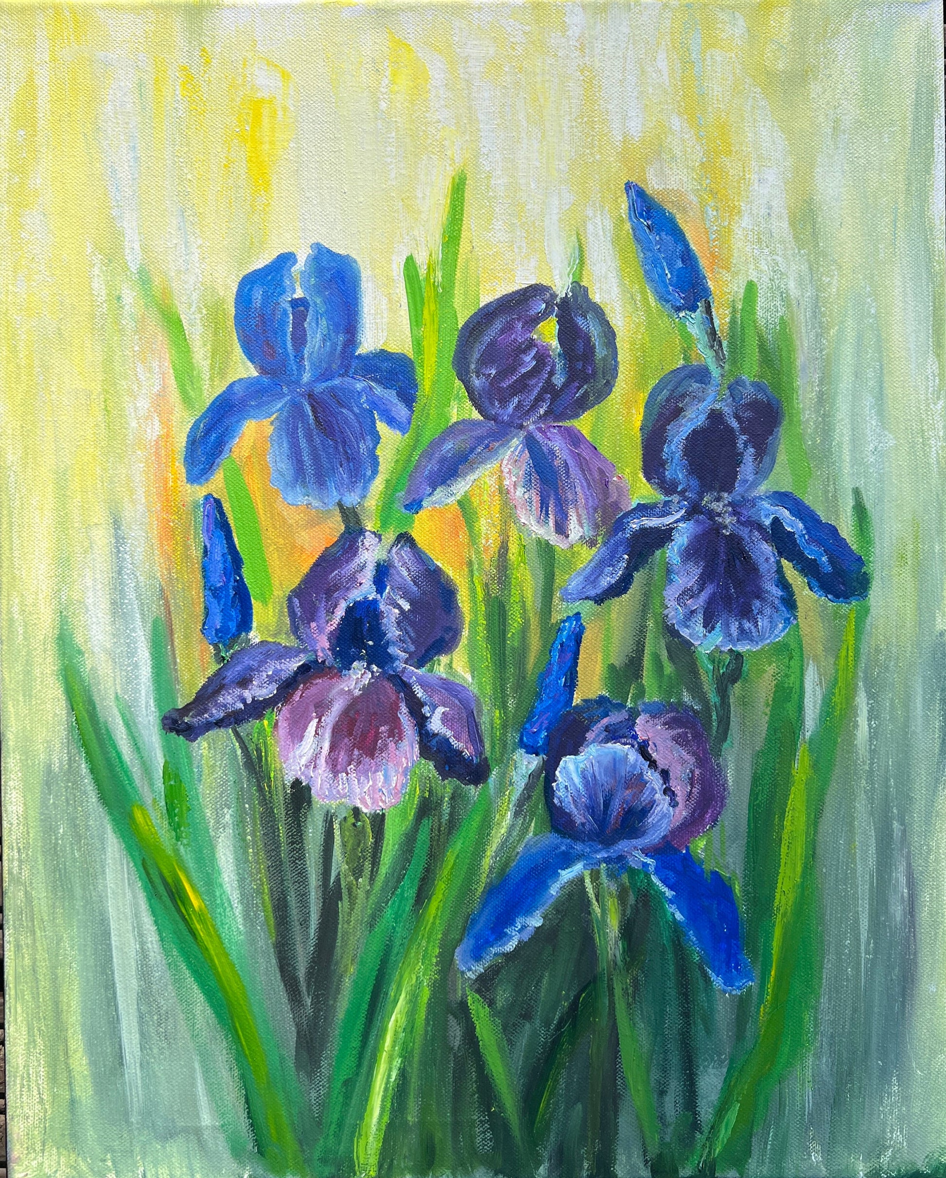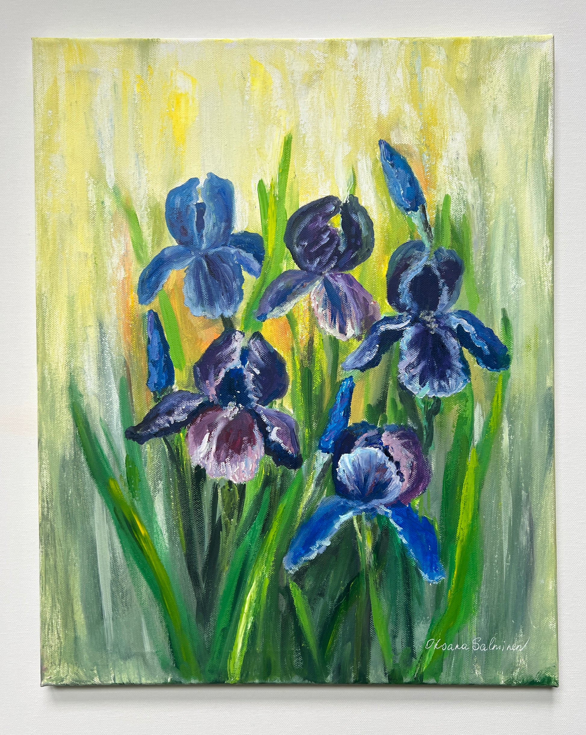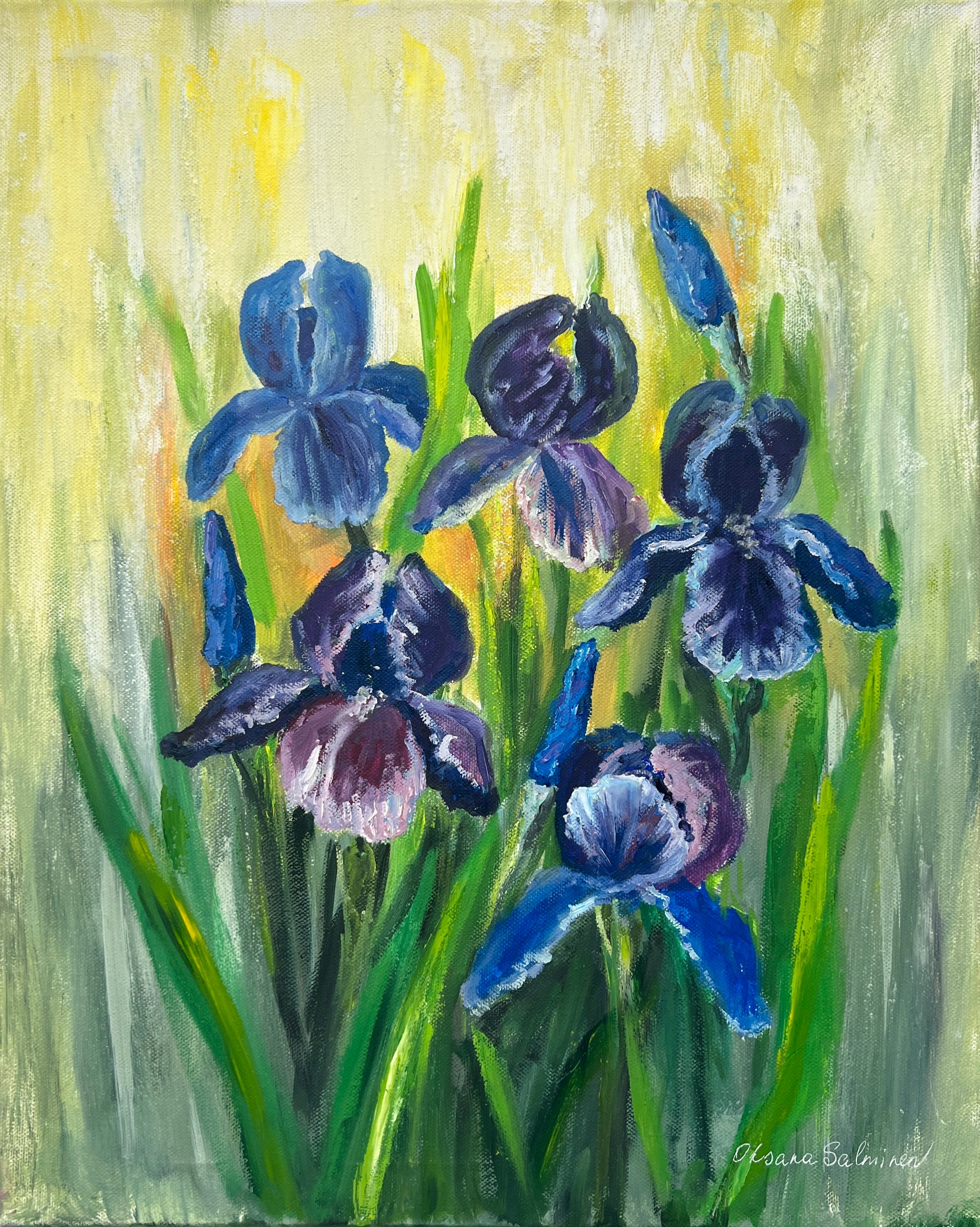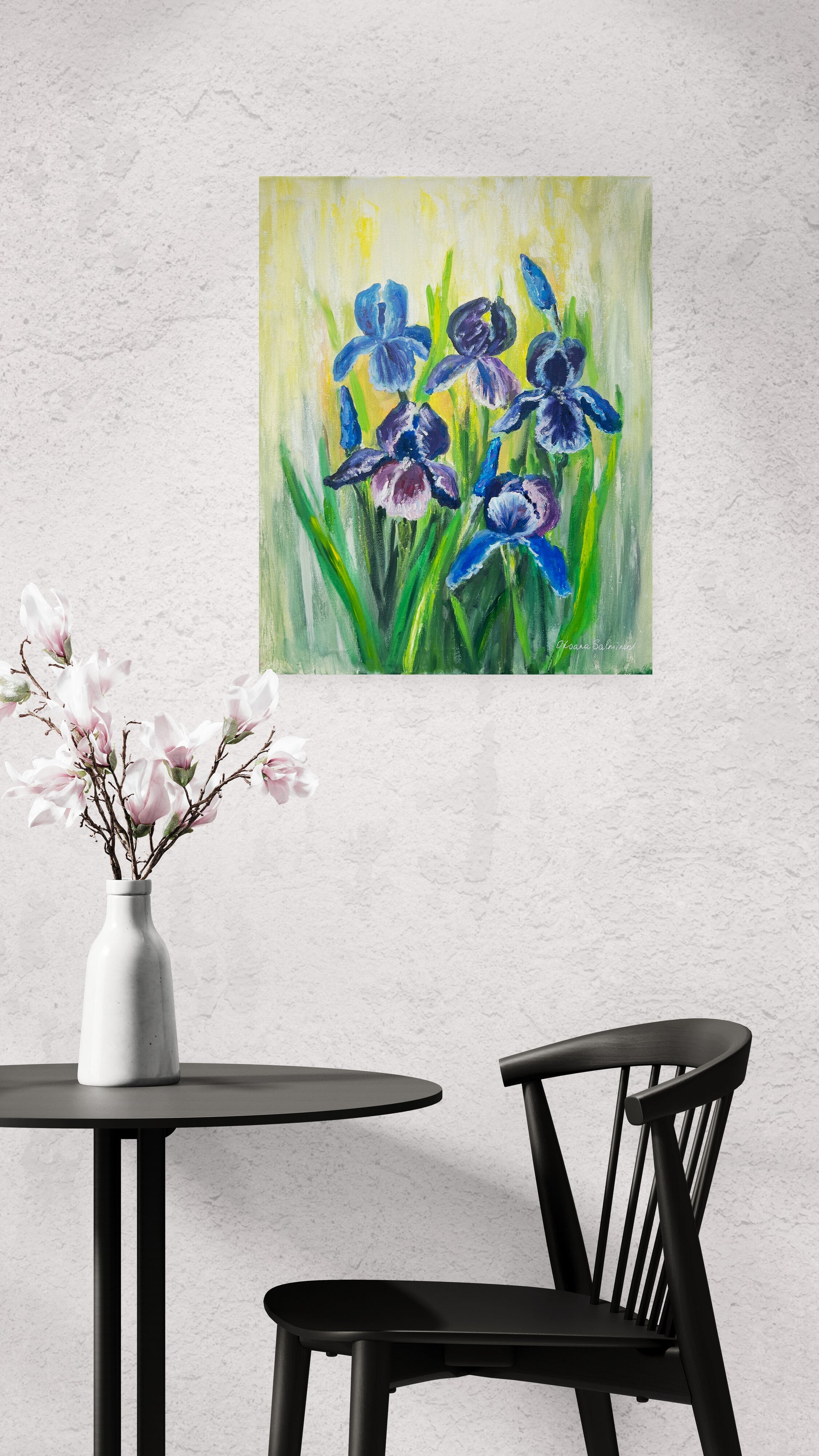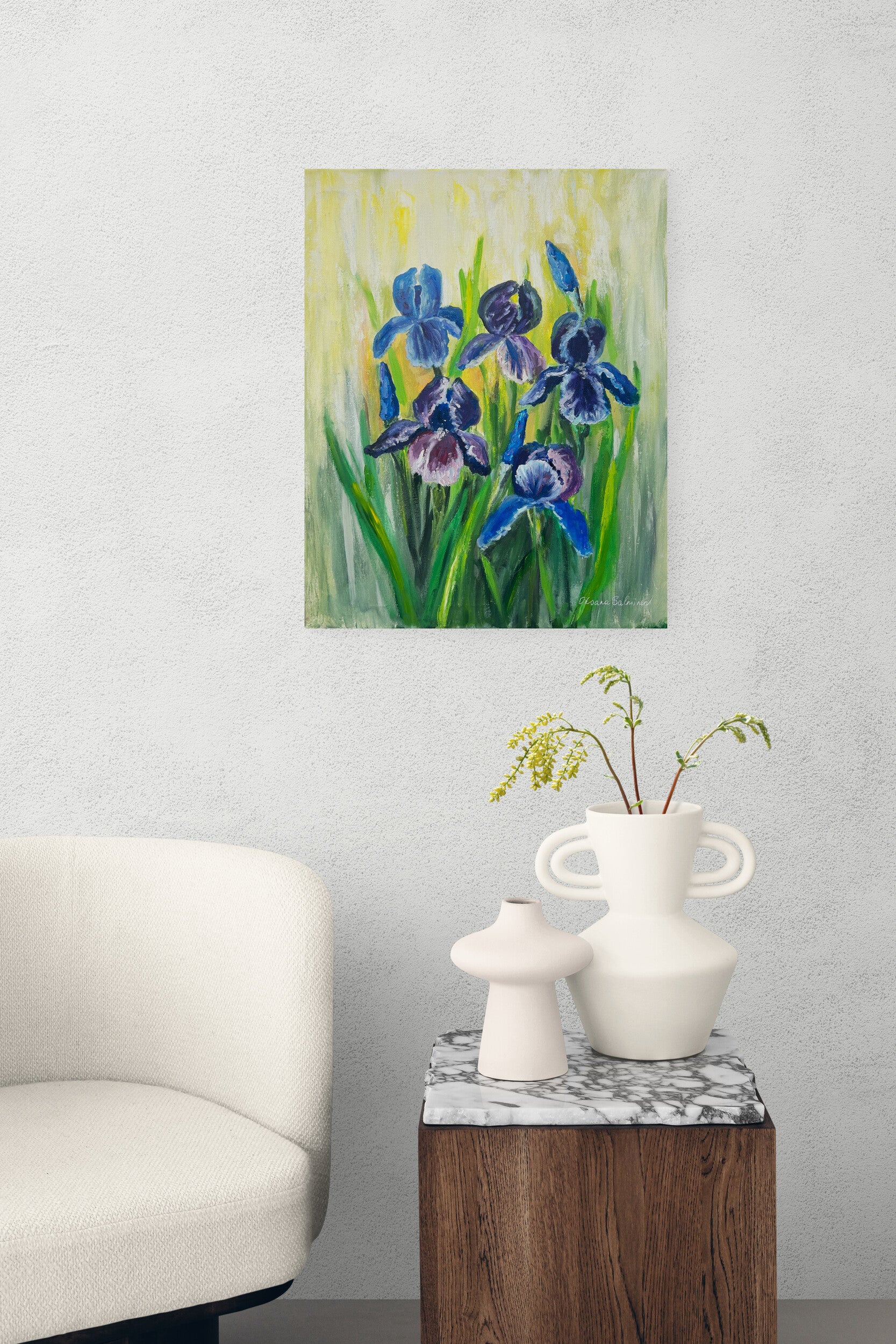 Original oil impasto painting on canvas "Sunny Irises" the luxurious and sophisticated beauty of blooming iris flowers.