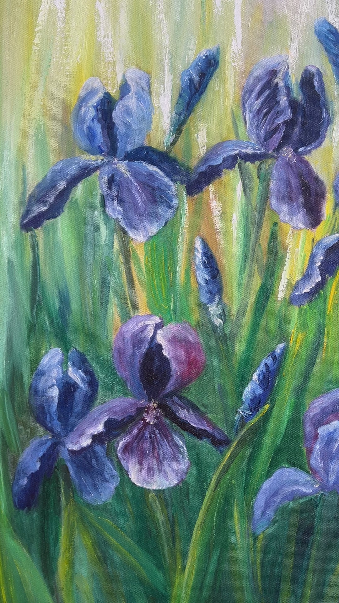 Original oil impasto painting, the luxurious and sophisticated beauty of blooming iris flowers.