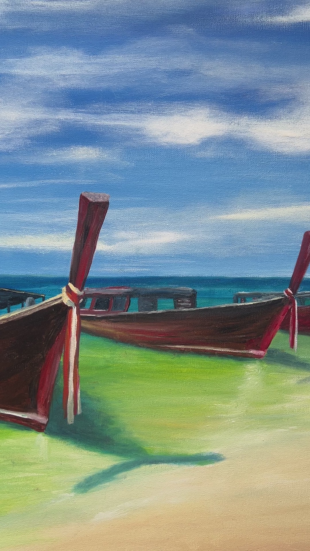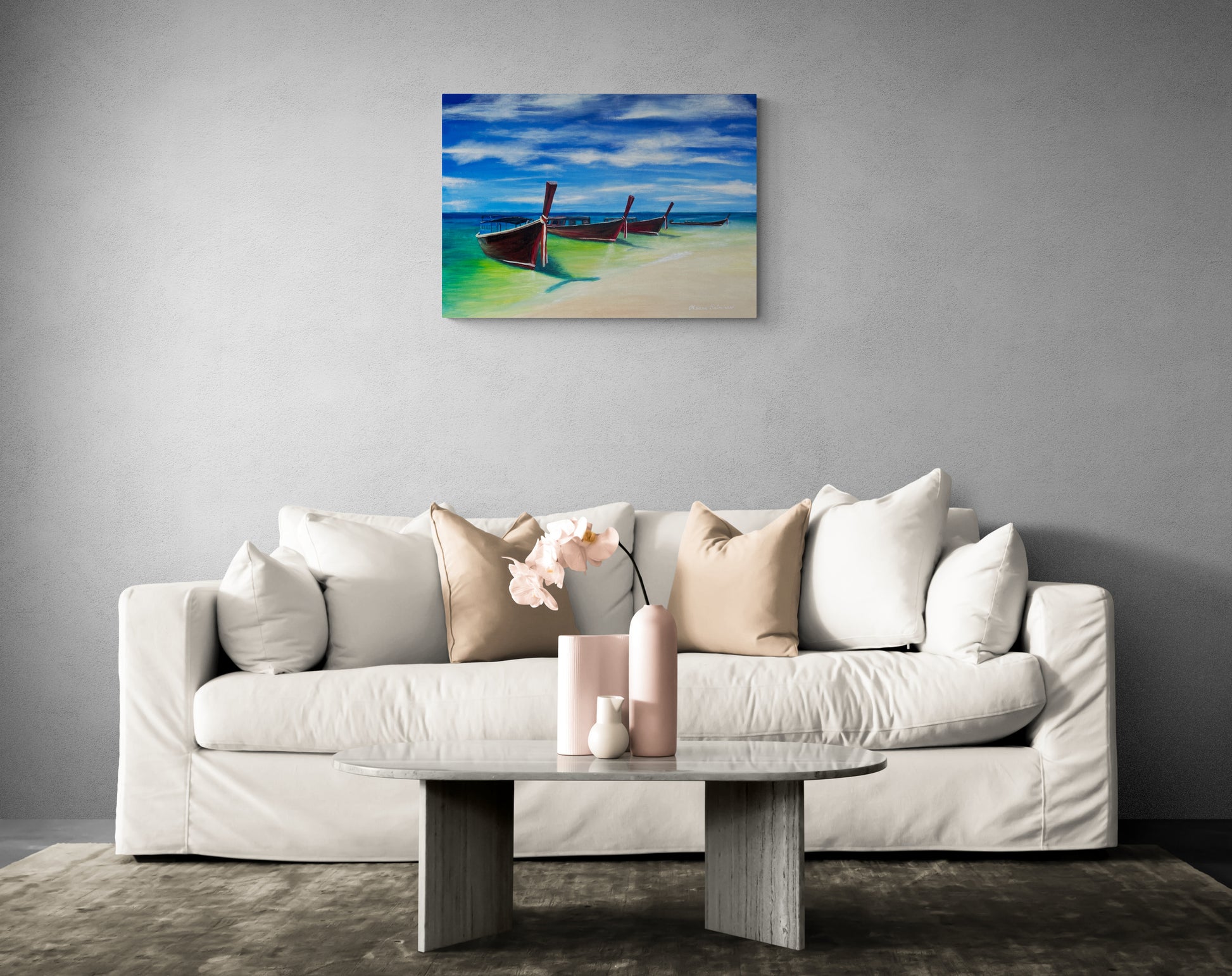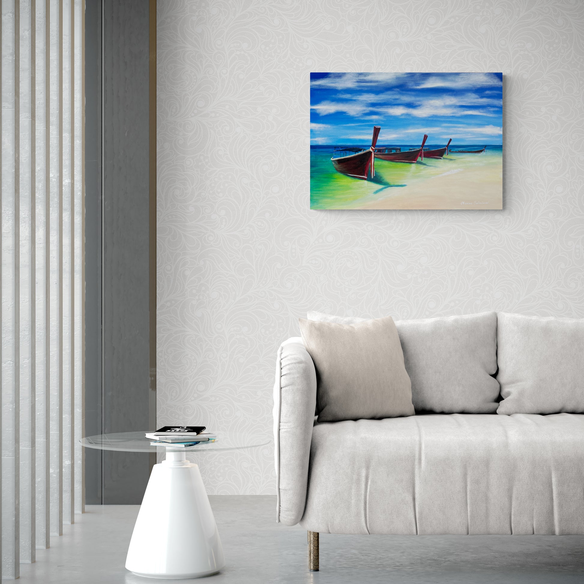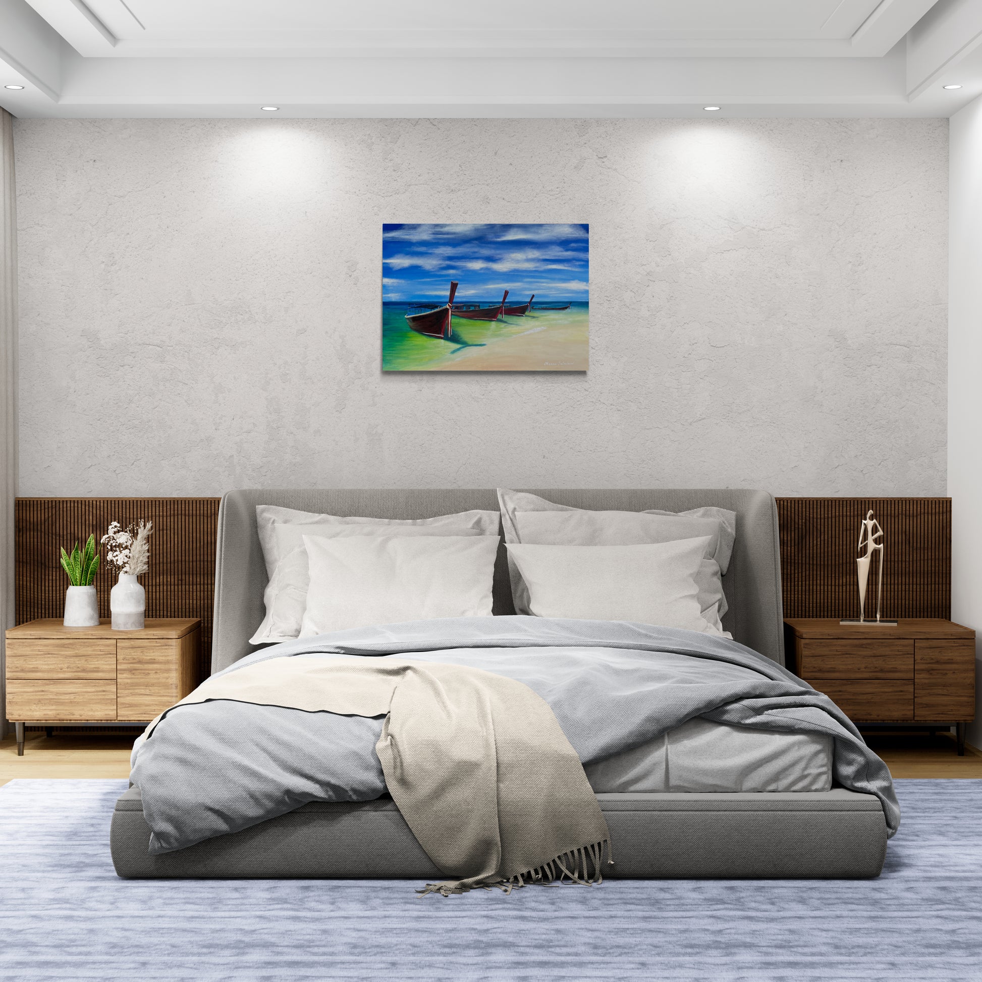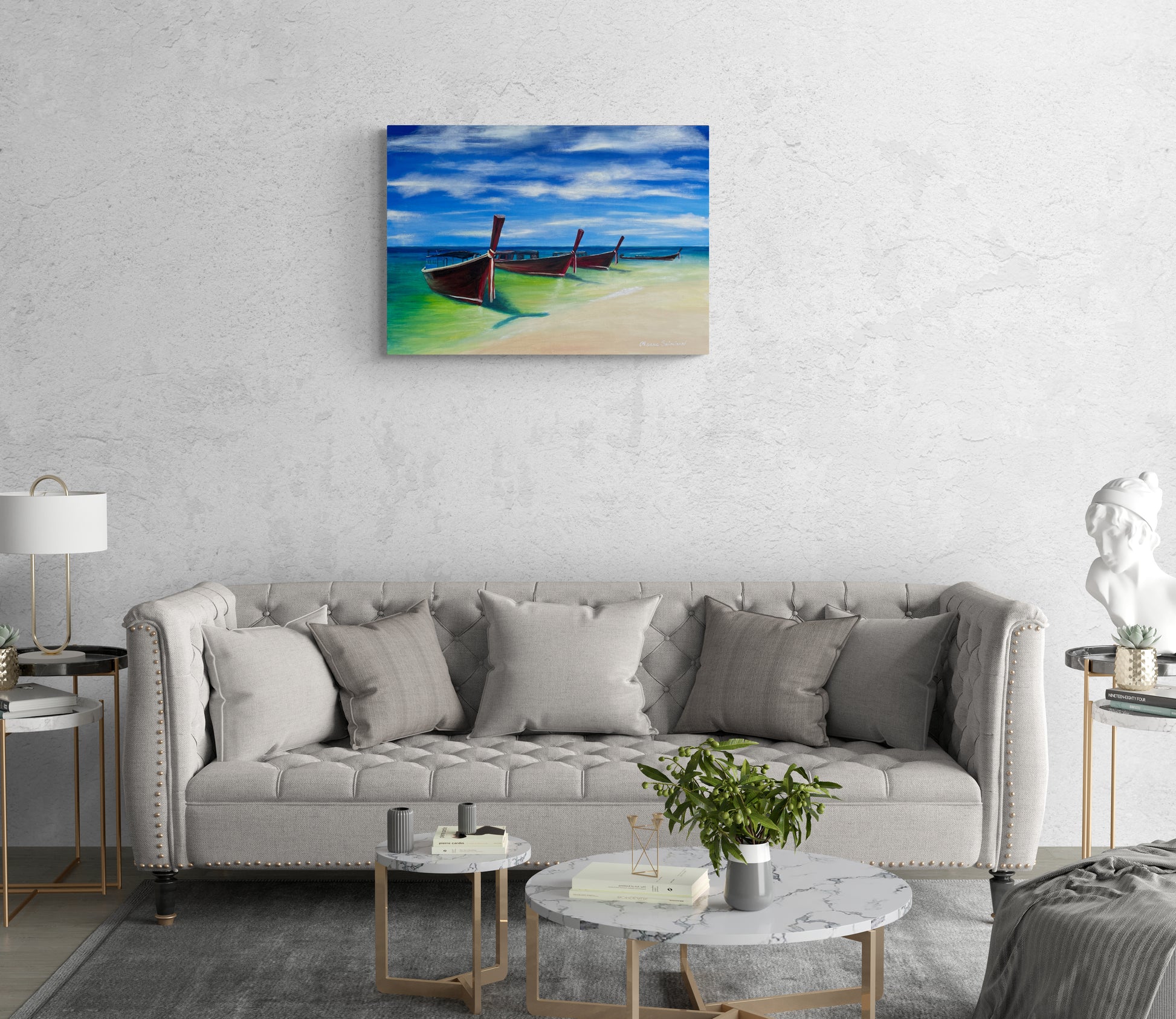 Blue colors of sea and yellow sand with brown sailing boats at the shore bring beautiful seascape vibe to any modern interior and touch of contemporary marine art to your home. Romantic and warm painting.