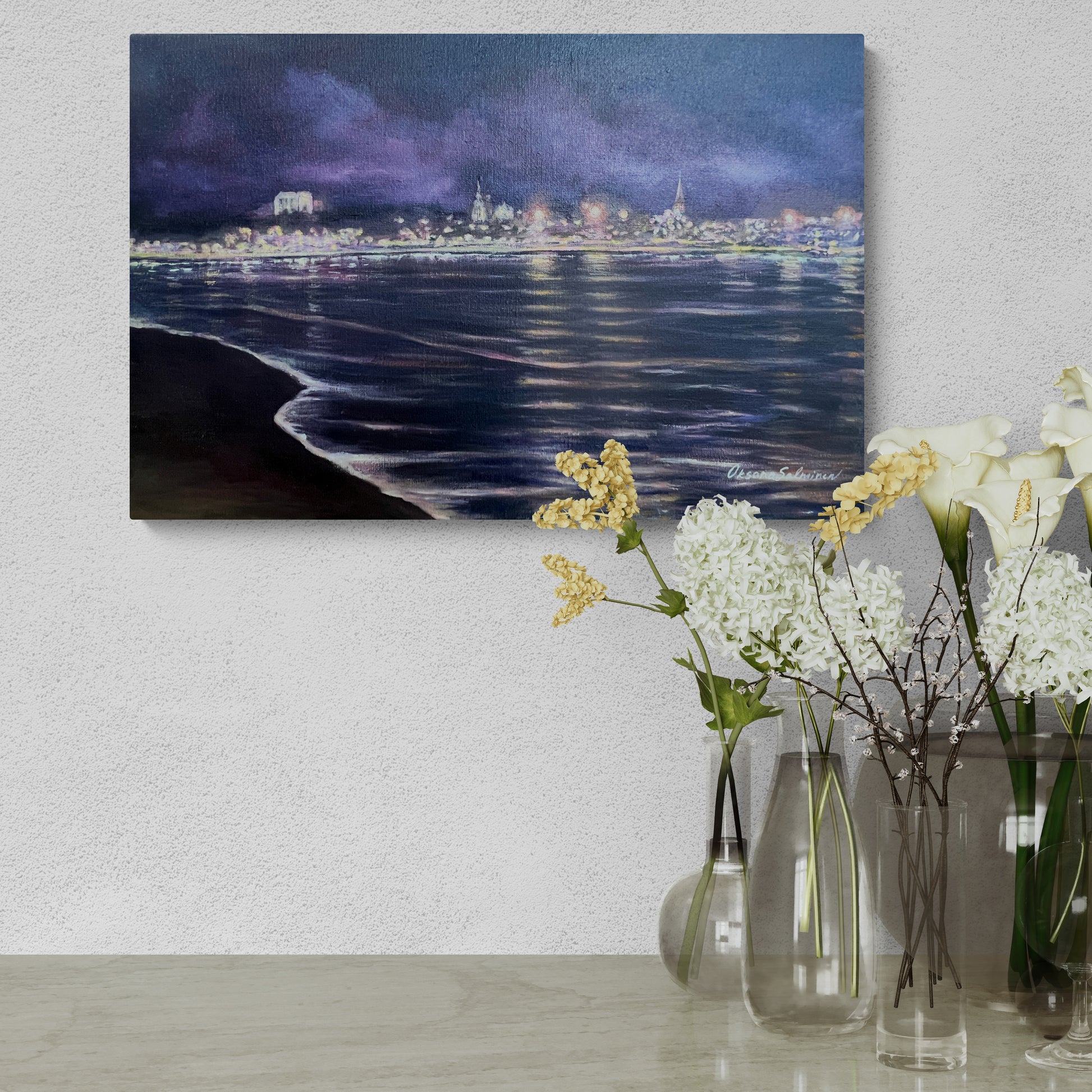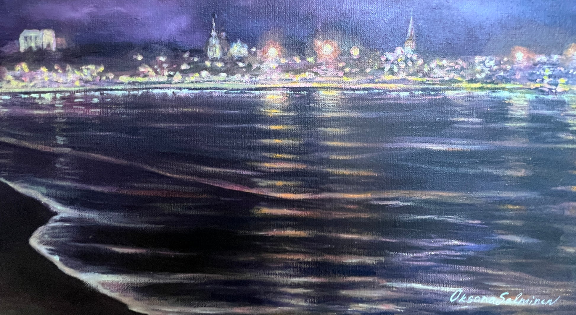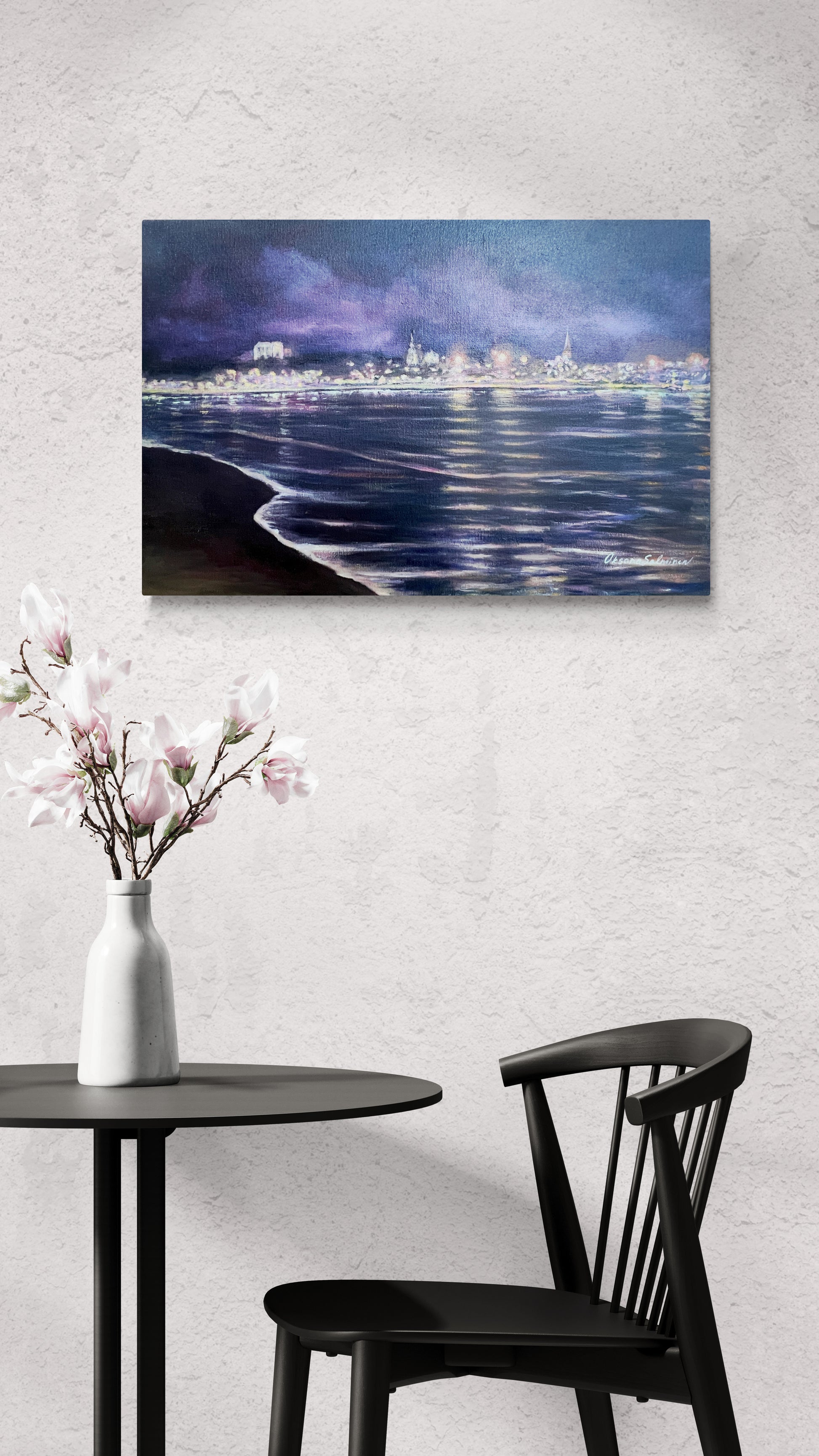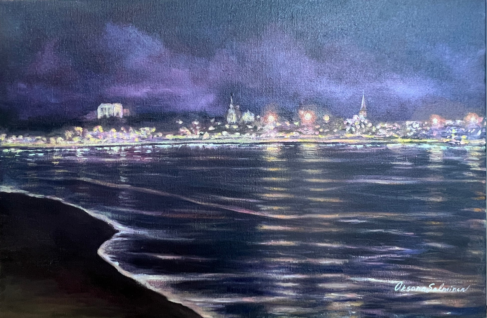 Tallinn is located on the bank of the Baltic Sea, and the view from the sea at night is amazing. Terrific purple and yellow lights make this painting unique and outline the beauty of the historical town.
