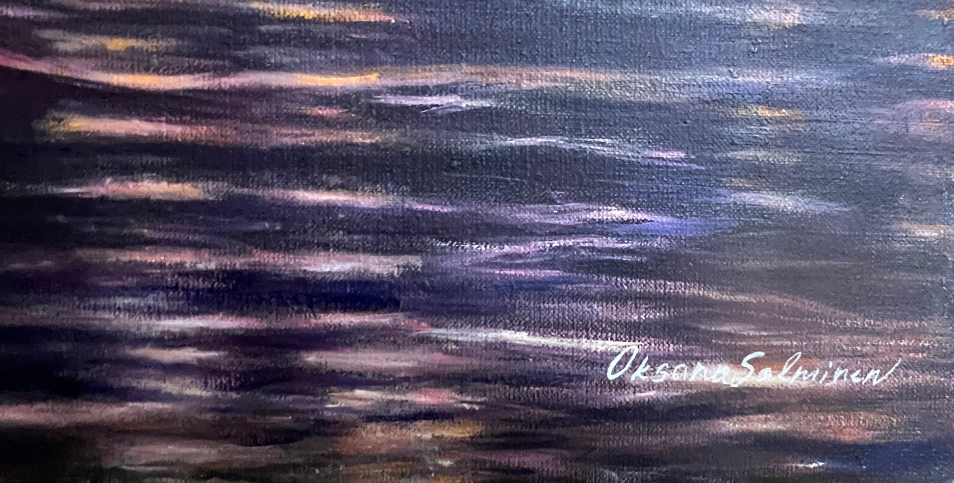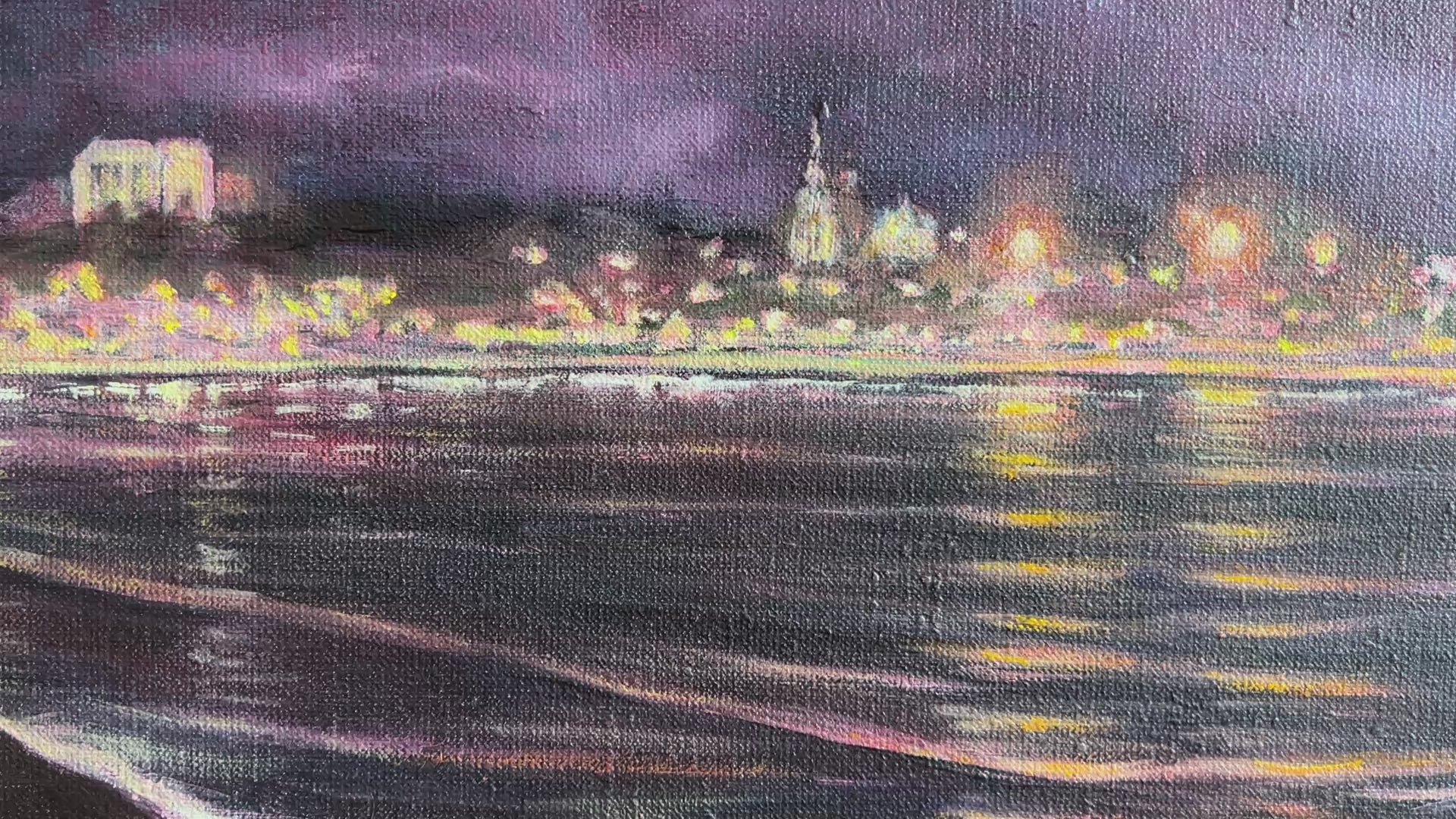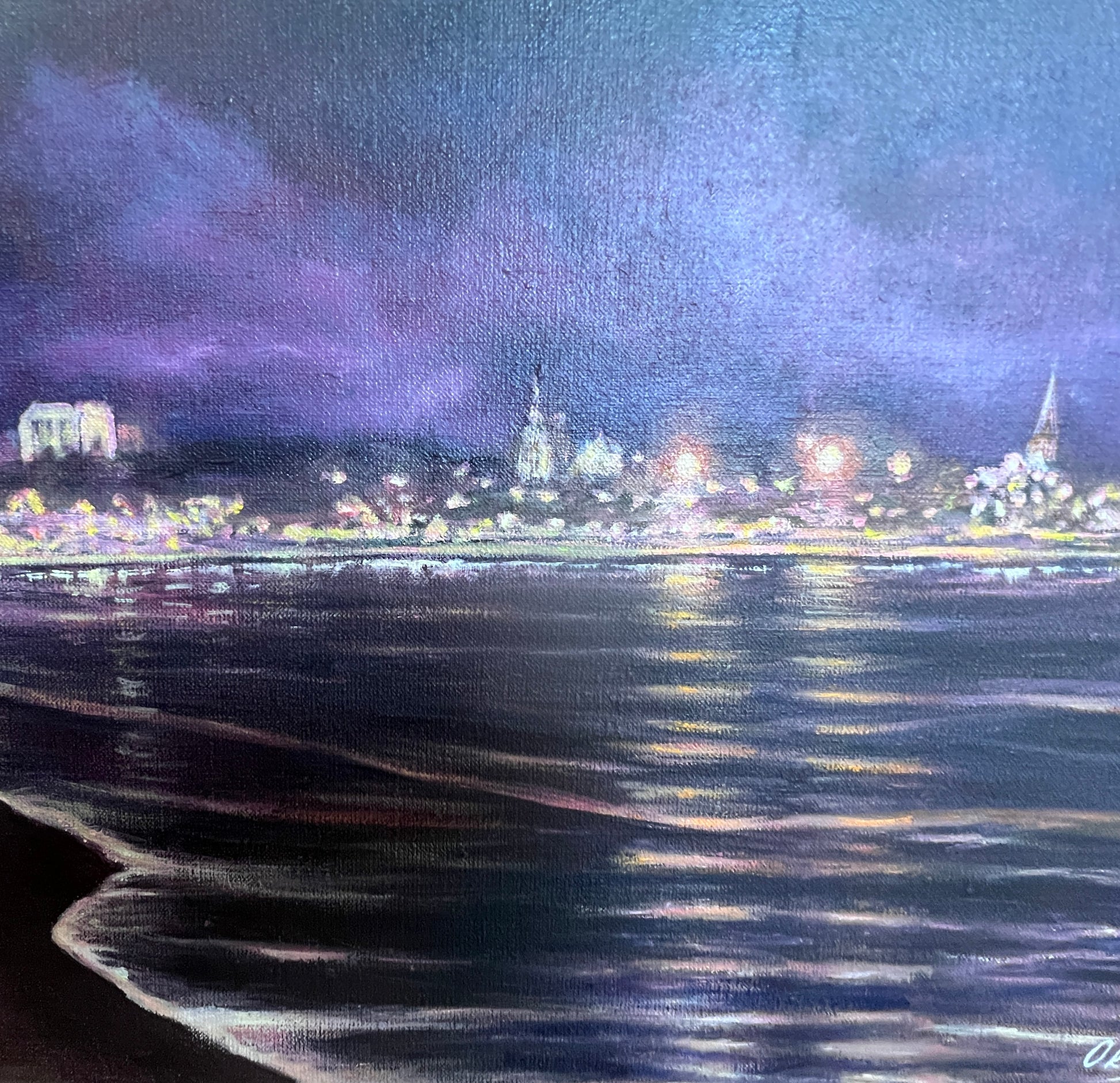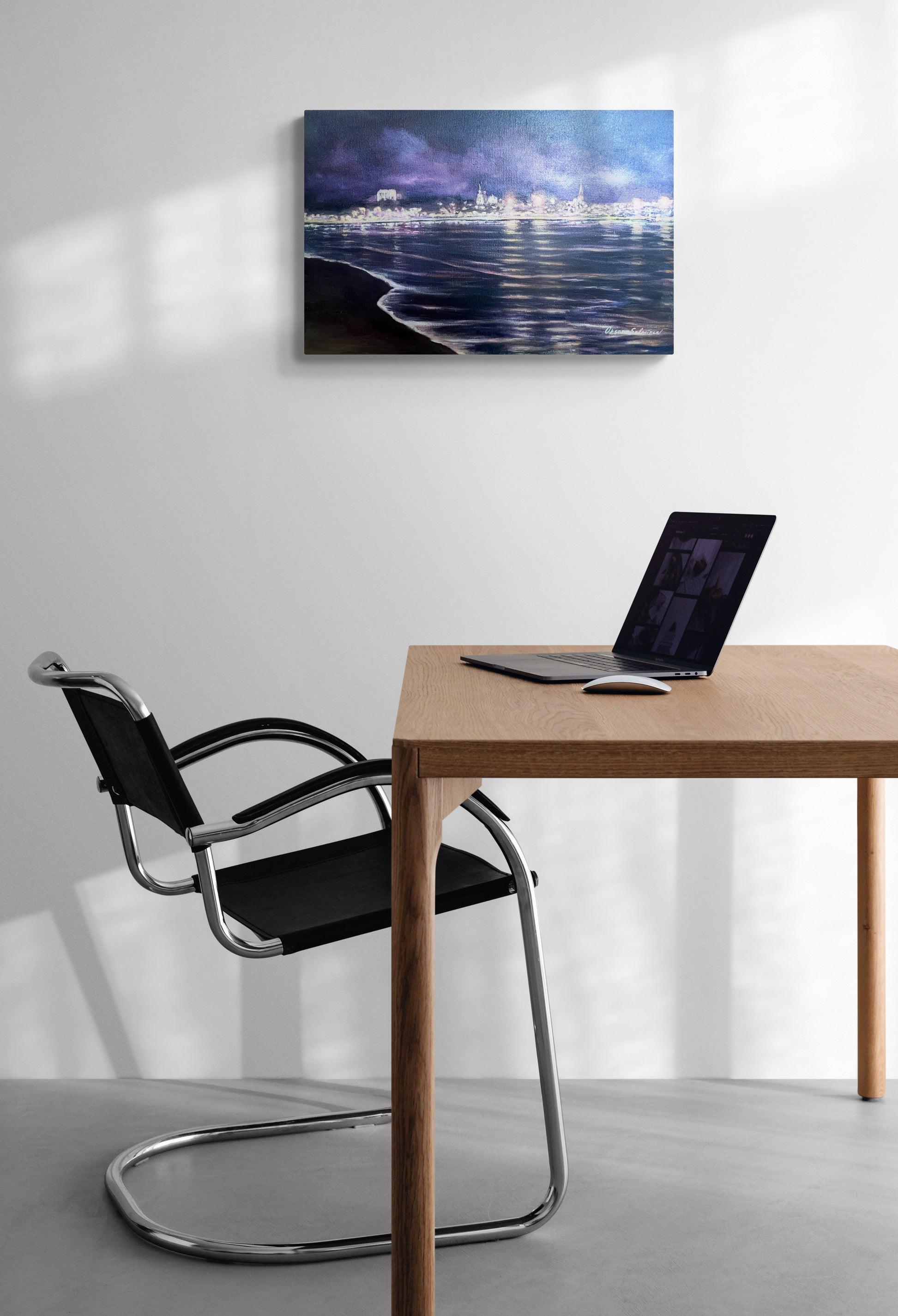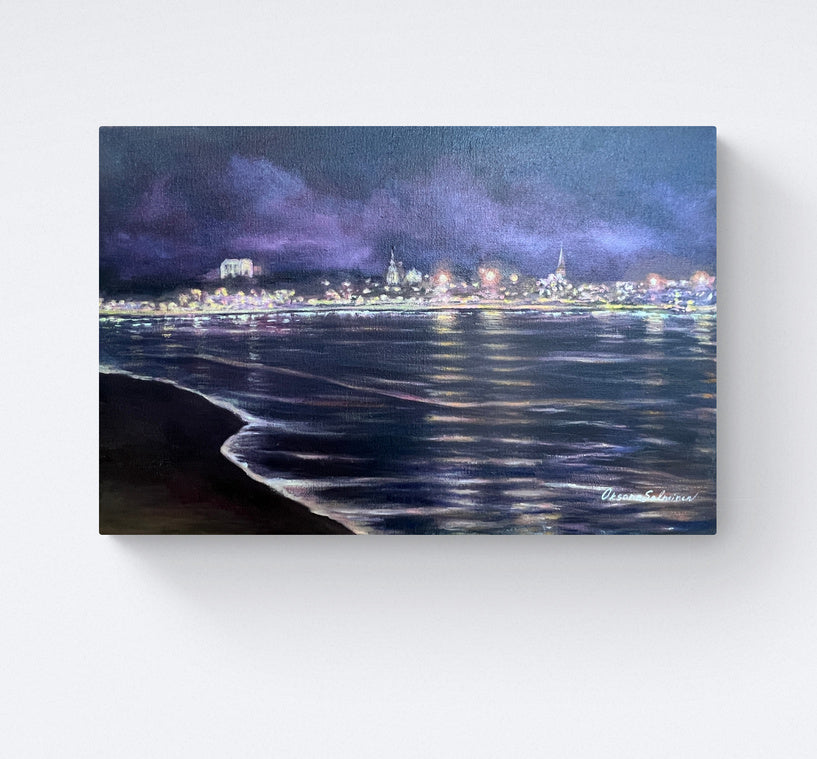 Tallinn is located on the bank of the Baltic Sea, and the view from the sea at night is amazing. Terrific purple and yellow lights make this painting unique and outline the beauty of the historical town.