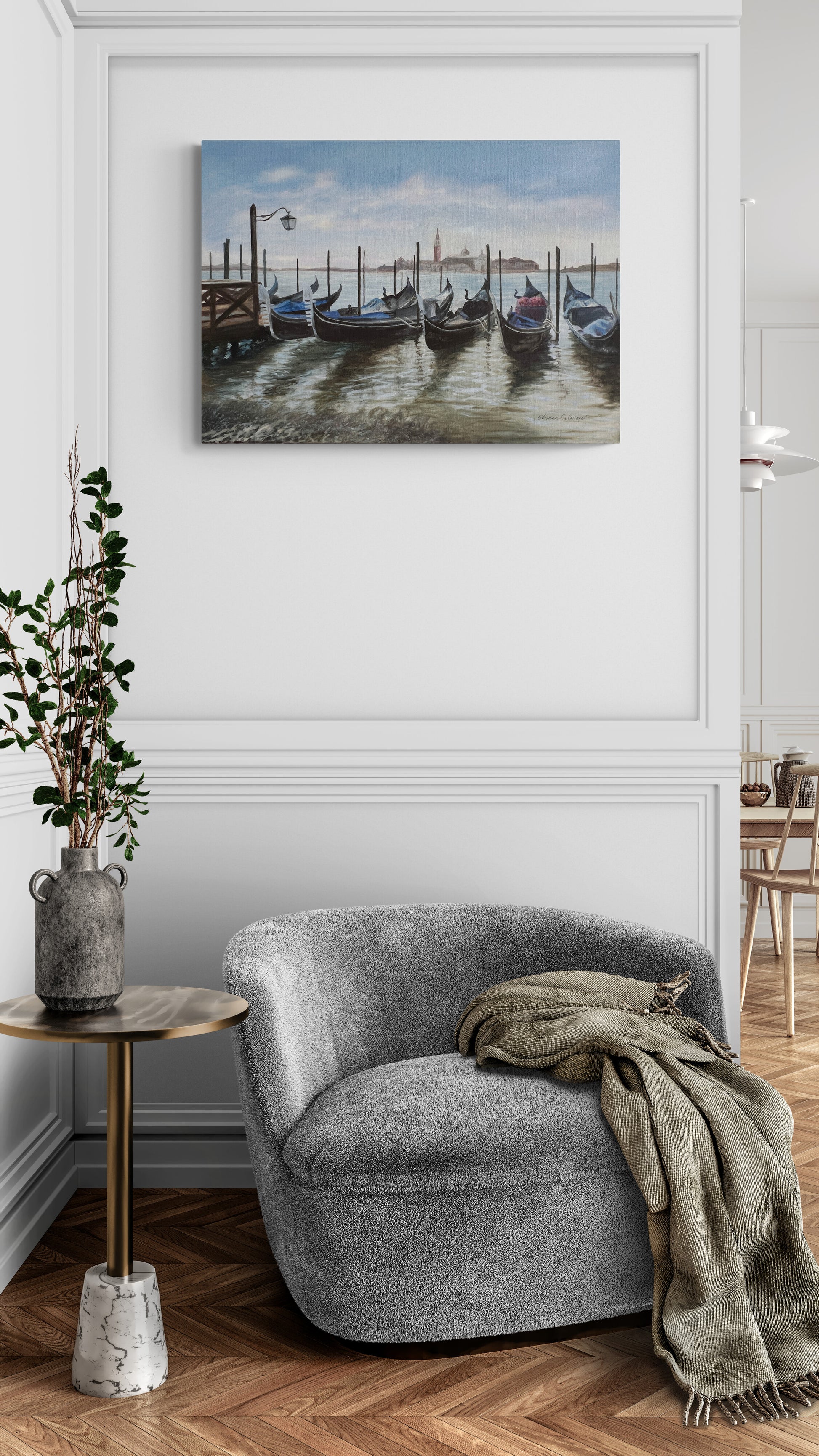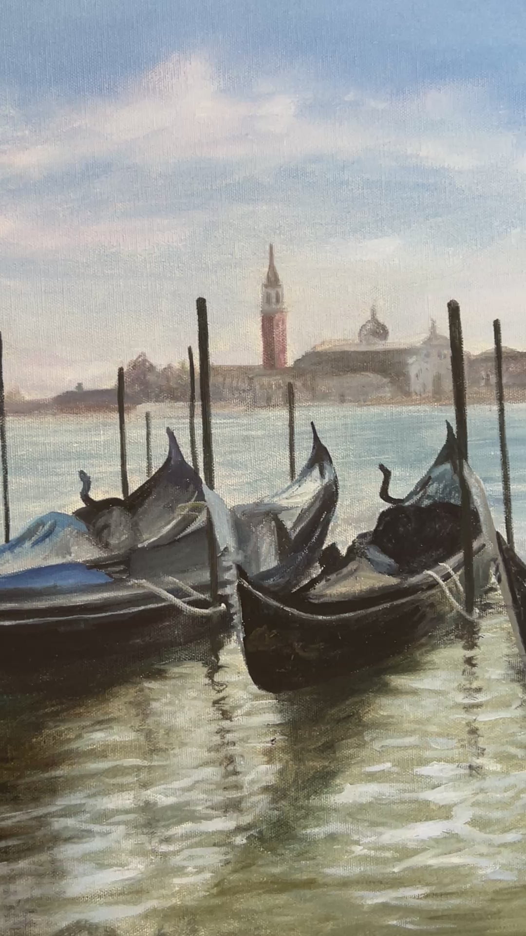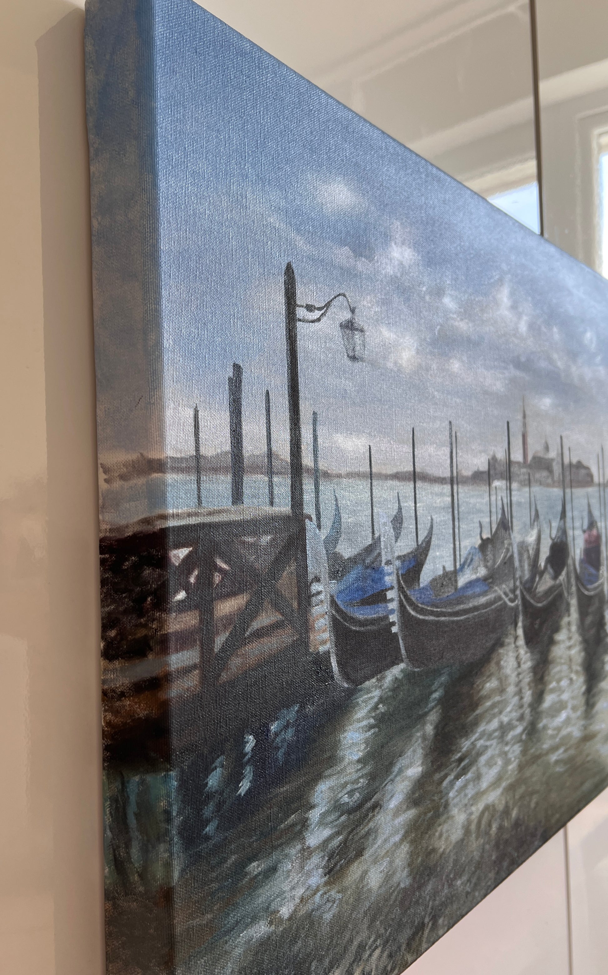In my artwork, I sought to encapsulate the serene beauty of winter in Venice. With oil paints, I blended impressionism and realism to convey the melancholic charm of moored gondolas set against a frosty, azure sky. This piece is crafted to infuse any space with tranquil beauty and timeless elegance.