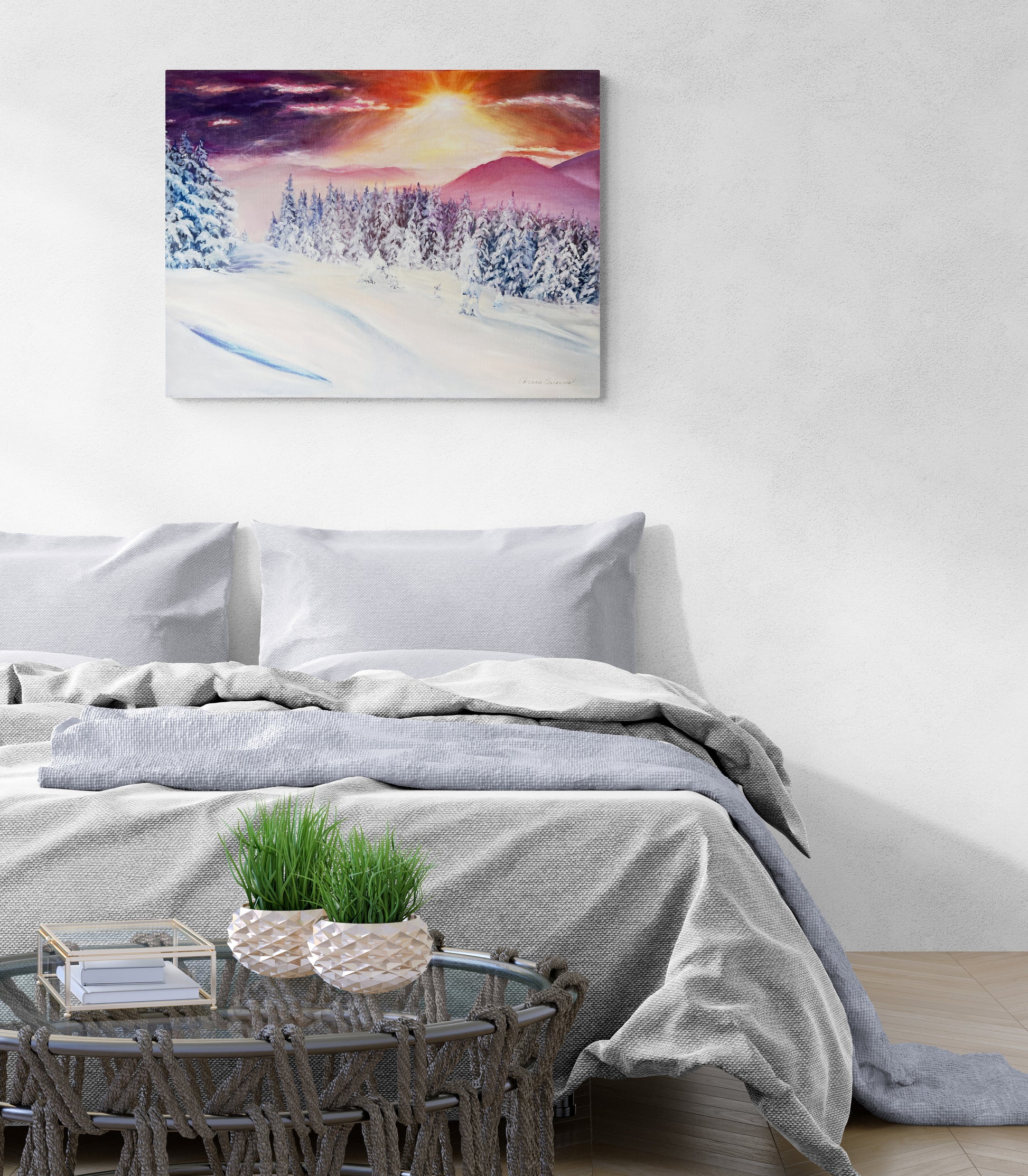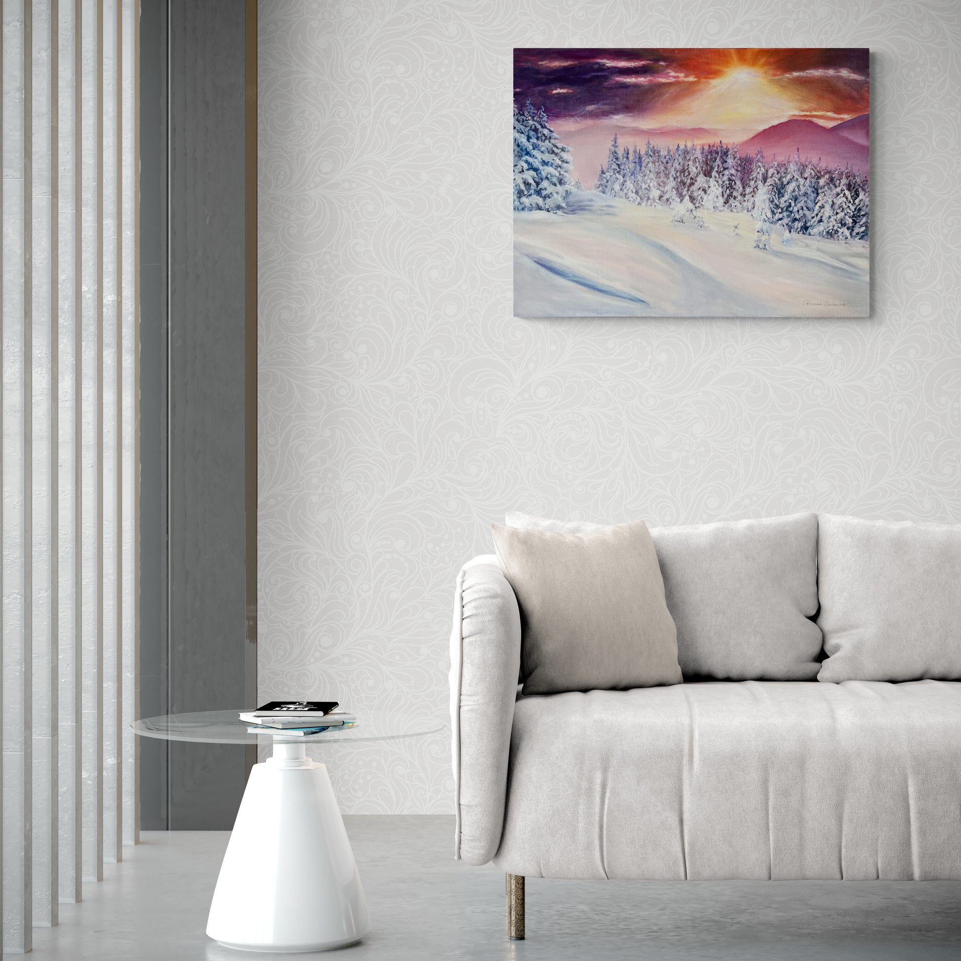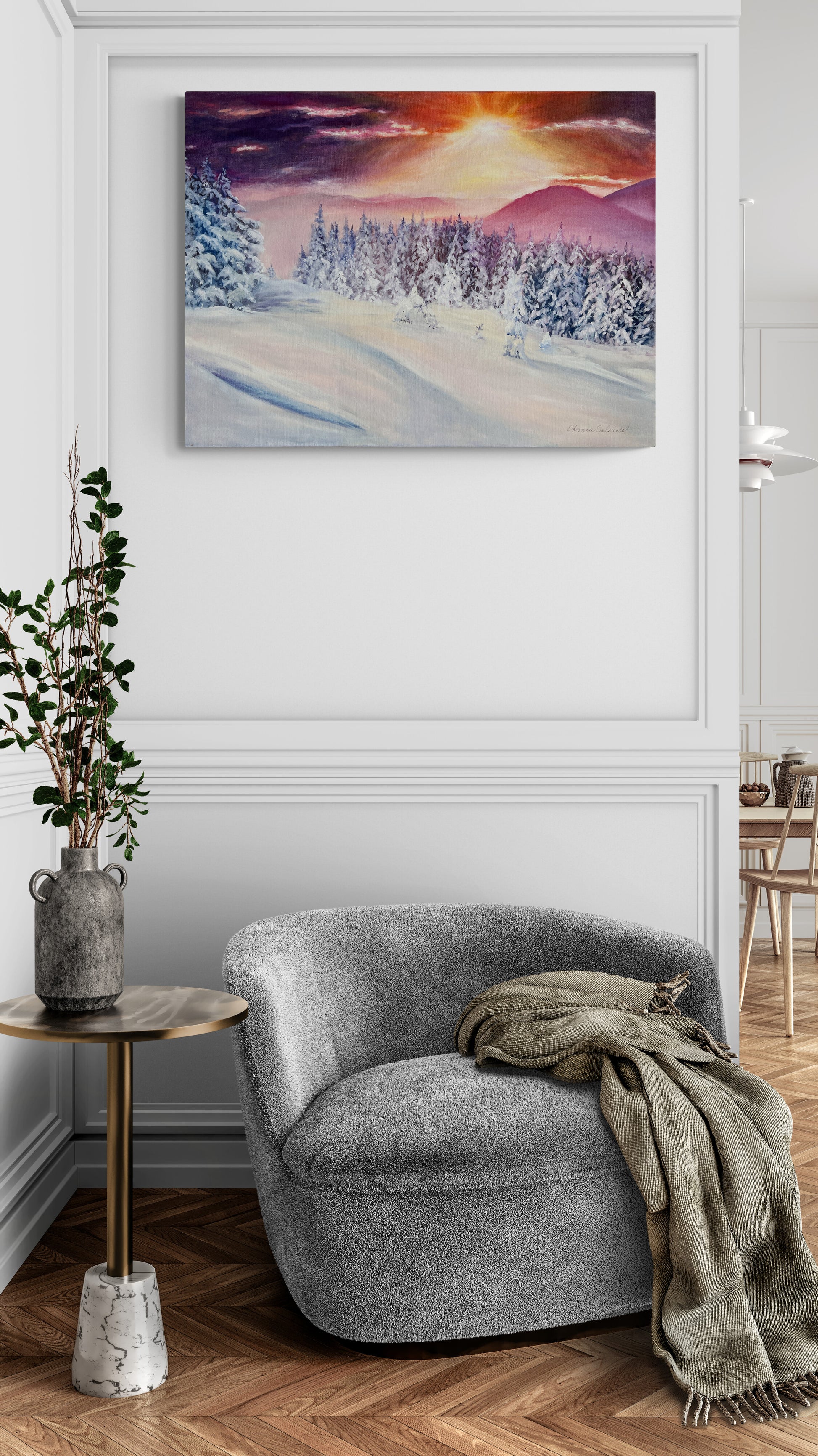 In creating this piece, I sought to blend the crisp realism of a snow-covered landscape with the semi-abstract art. The artwork invites viewers into a peaceful, introspective moment, adding a touch of tranquil beauty to any space.